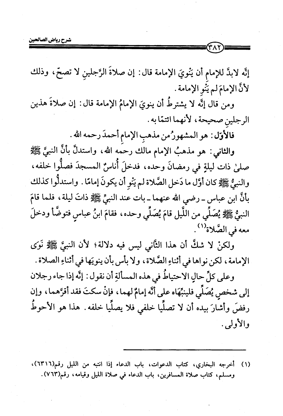 والثاني: هو مذهب الإمام مالك رحمه الله، واستدل بان النبي صلي الله عليه وسلم صلي ذات ليلة في رمضان وحده، فدخل أناس المسجد فصلوا خلفه، والنبي صلي الله عليه وسلم كان أول ما دخل الصلاة لم ينو أن يكون إماما. واستدلوا كذلك بان ابن العباس_ رضي الله عنهما_ بات عند النبي صلي الله عليه وسلم_ ذات ليلة، فلما قام النبي صلي الله عليه وسلم يصلي من الليل قام يصلي وحده، فقام ابن عباس فتوضأ ودخل معه في الصلاة. ولكن لا شك أن هذا الثاني ليس في دلالة، لان النبي صلي الله عليه وسلم نوي الإمامة، لكن نواها في أثناء الصلاة، ولا باس بان ينويها في أثناء الصلاة. وعلي كل حال الاحتياط في هذه المسالة أن نقول: انه إذا جاء رجلان إلى شخص يصلي فلينبهاه علي انه إمام لهما، فان سكت فقد اقرهما، وان رفض وأشار بيده أن لا تصليا خلفي فلا يصليا خلفه. هذا هو الاحوط والأولى.
