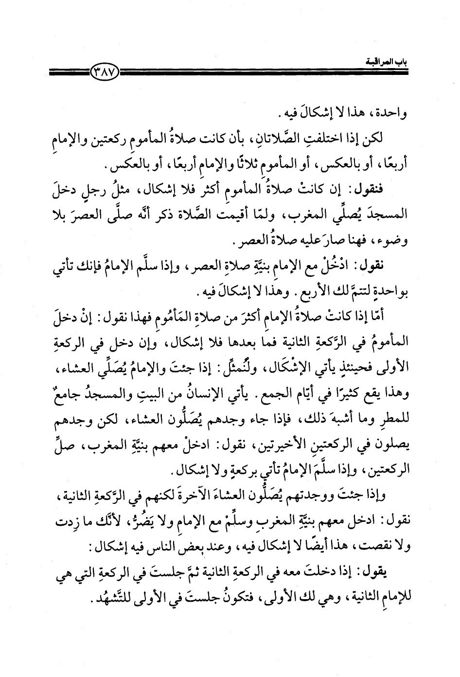 واحدة، هذا لا إشكال فيه. لكن إذا اختلفت الصلاتان، بان كانت صلاة المأموم ركعتين والإمام أربعا، أو بالعكس، أو المأموم ثلاثا والإمام أربعا، أو بالعكس. فنقول: أن كانت صلاة المأموم اكثر فلا إشكال، مثل رجل دخل المسجد يصلي المغرب، ولما أقيمت الصلاة ذكر انه صلي العصر بلا وضوء، فهنا صار عليه صلاة العصر. نقول: ادخل مع الإمام بنية صلاة العصر، وإذا سلم الإمام فانك تأتى بواحدة لتتم لك الأربع. وهذا لا إشكال فيه. أما إذا كانت صلاة الإمام اكثر من صلاة المأموم فهذا نقول: أن دخل المأموم في الركعة الثانية فما بعدها فلا إشكال، وان دخل في الركعة الأولى فحيئنذ يأتي الإشكال، ولنمثل: إذا جئت والإمام يصلي العشاء، وهذا يقع كثيرا في أيام الجمع. يأتي الإنسان من البيت والمسجد جامع للمطر أو ما أشبه ذلك، فإذا جاء وجدهم يصلون العشاء، لكن وجدهم يصلون في الركعتين الأخيرتين، نقول: ادخل معهم