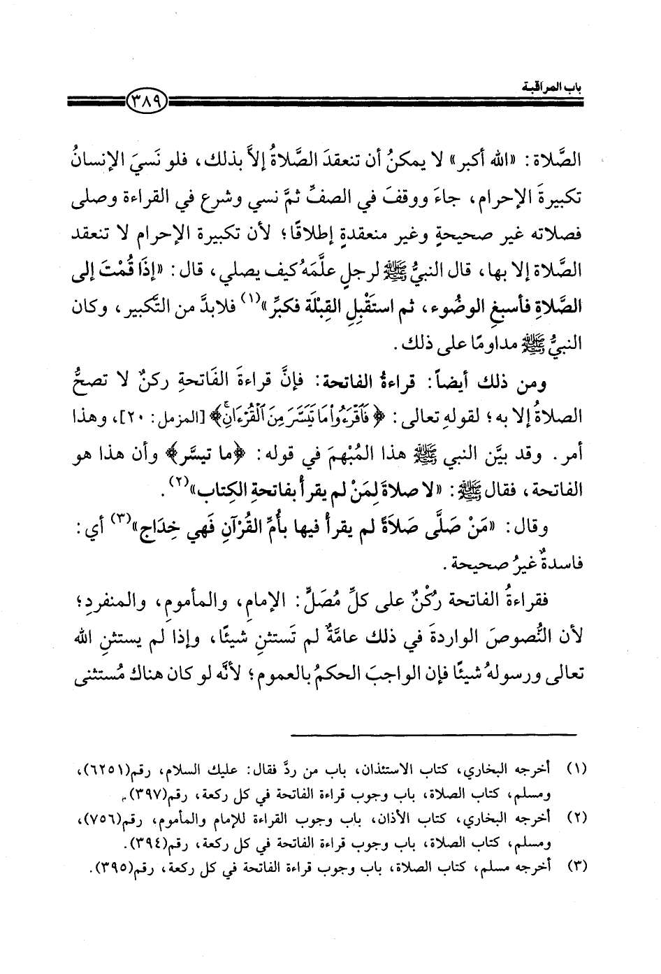 الصلاة: ((الله اكبر)) لا يمكن أن تنعقد الصلاة فلو نسي الإنسان تكبيرة الإحرام، جاء ووقف في الصف ثم نسي وشرع في القراءة وصلي فصلاته غير صحيحة وغير منعقدة إطلاقا، لان تكبيرة الإحرام لا تنعقد الصلاة إلا بها، قال النبي صلي الله عليه وسلم لرجل علمه كيف يصلي، قال: ((إذا قمت إلى الصلاة فاسبغ الوضوء، ثم استقبل القبلة فكبر)) فلابد من التكبير، وكان النبي صلي الله عليه وسلم مداوما علي ذلك. ومن ذلك أيضا: قراءة الفاتحة: فان قراءة الفاتحة ركن لا تصح الصلاة إلا به، لقوله تعالى: (فَاقْرَأُوا مَا تَيَسَّرَ مِنَ الْقُرْآنِ) (المزمل: من الآية20) ،