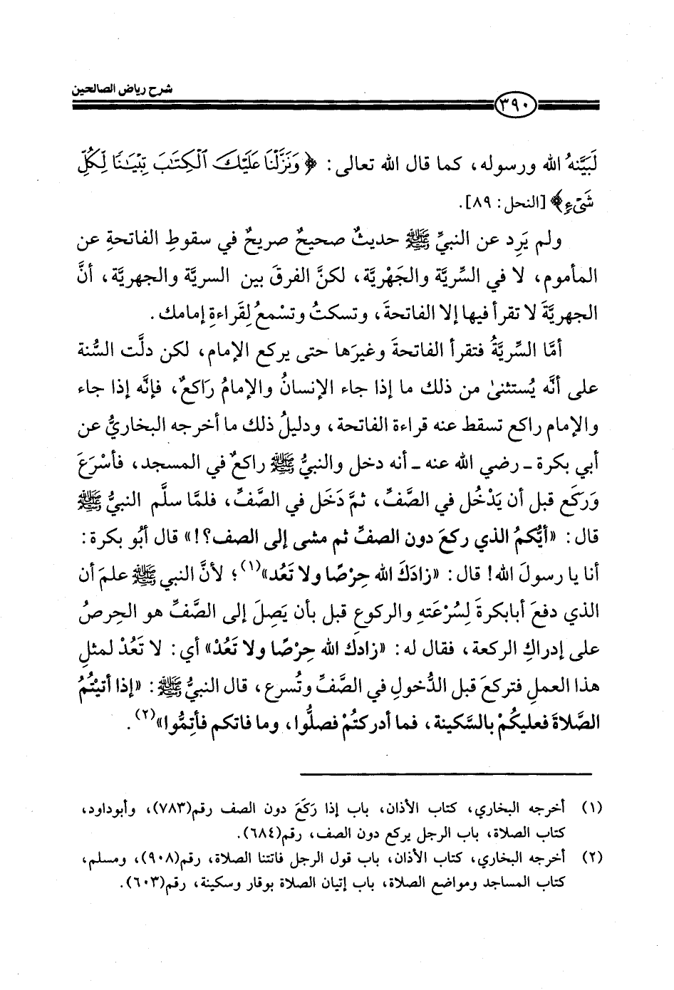 لبينه الله ورسوله، كما قال الله تعالى: (وَنَزَّلْنَا عَلَيْكَ الْكِتَابَ تِبْيَاناً لِكُلِّ شَيْءٍ) (النحل: من الآية89) ولم يرد عن النبي صلي الله عليه وسلم حديث صحيح صريح في سقوط الفاتحة عن المأموم، لا في السرية والجهرية، لكن الفرق بين السرية والجهرية، أن الجهرية لا تقرا فيها إلا الفاتحة، وتسكت وتسمع لقراءة إمامك. أما السرية فتقرا الفاتحة وغيرها حتى يركع الإمام، لكن دلت السنة علي انه يستثني من ذلك ما إذا جاء الإنسان والإمام راكع، فانه إذا جاء والإمام راكع تسقط عنه قراءة الفاتحة، ودليل ذلك ما أخرجه البخاري عن آبي بكرة_ رضي الله عنه_ انه دخل والنبي صلي الله