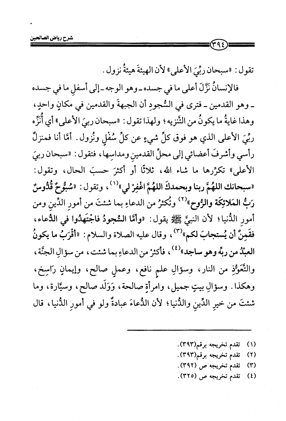 تقول: ((سبحان ربي الأعلى)) لان الهيئة هيئة نزول. فالإنسان نزل اعلي أفي جسده_ وهو الوجه _ إلى اسفل ما في جسده_ وهو القدمين_ فتري في السجود أن الجبهة والقدمين في مكان واحد، وهذا غاية ما يكون في التنزيه، ولهذا تقول: ((سبحان ربي الأعلى)) أي أنزه ربي الأعلى الذي هو فوق كل شئ عن كل سفل ونزول. أما أنا فمنزل رأسي واشرف أعضائي إلى محل القدمين ومداسها، فتقول: ((سبحان ربي العلي)) تكررها ما شاء الله، ثلاثا أو اكثر حسب الحال، وتقول: ((سبحانك اللهم ربنا وبحمدك اللهم اغفر لي)) (،) وتقول ((سبوح قدوس رب الملائكة والروح)) وتكثر من الدعاء بما شئت من أمور الدين ومن أمور الدنيا، لان النبي صلي الله عليه مسلم يقول: ((وأما السجود فاجتهدوا في الدعاء، فقمن أن يستجاب لكم)) (،) وقال عليه الصلاة والسلام: ((اقرب ما يكون العبد من ربه وهو ساجد)) (،) فاكثر من الدعاء بما شئت، من سؤال الجنة، والتعوذ من النار، وسؤال علم نافع، وعمل صالح، وإيمان راسخ، وهكذا. وسؤال بيت جميل، وامرأة صالحة، وولد صالح، وسيارة، وما