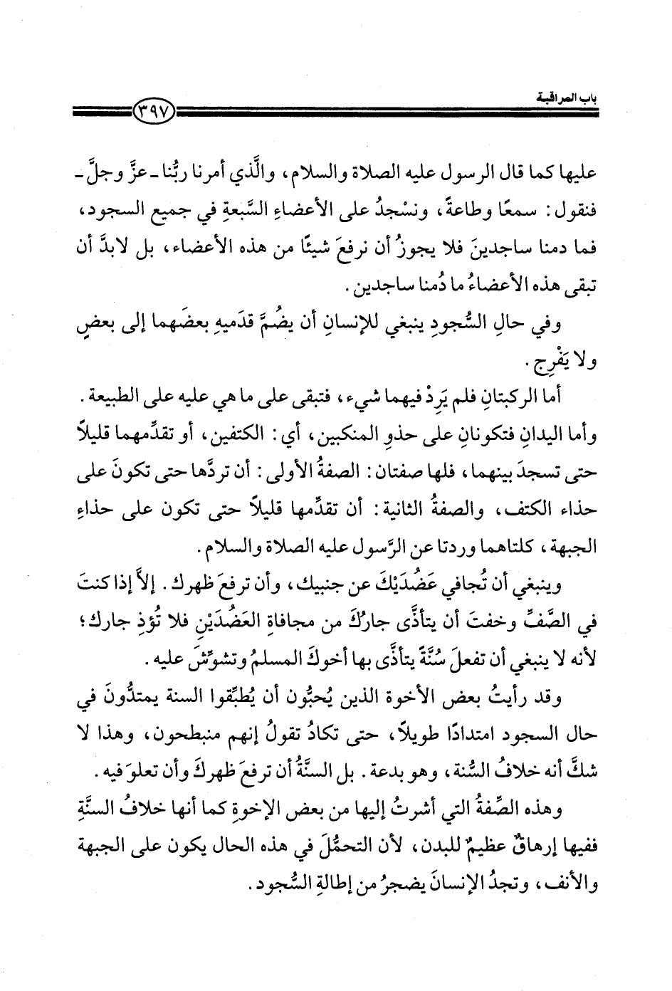 عليهما كما قال الرسول عليه الصلاة والسلام، والذي امرنا ربنا_ عز وجل_ فنقول: سمعا وطاعة، ونسجد علي الأعضاء السبعة في جميع السجود، فما دمنا ساجد ينفلا يجوز أن نرفع شيئا من هذه الأعضاء، بل لابد أن تبقي هذه الأعضاء ما دمنا ساجدين. وفي حال السجود ينبغي للإنسان أن يضم قدميه بعضها إلى بعض ولا يفرج. أما الركبتان فلم يرد فيهما شئ، فتبقي علي ما هي عليه علي الطبيعة. وأما اليدان فتكونان علي حذو المنكبين، أي: الكتفين، أو تقدمهما قليلا حتى تسجد بينهما، فلها صفتان: الصفة الأولى أن تردها حتى تكون علي حذاء الكتف، والصفة الثانية: أن تقدمها قليلا حتى تكون علي حذاء الجبهة، كلتاهما وردتا عن الرسول عليه الصلاة والسلام. وينبغي أن تجافي عضديك عن جنبيك، وان ترفع ظهرك. ألا إذا كنت في الصف وخفت أن يتأذى جارك من مجافاة العضدين فلا تؤذي جارك، لأنه لا ينبغي أن تفعل سنة يتأذى بها أخوك المسلم وتشوش عليه. وقد رأيت بعض الاخوة الذين يحبون أن