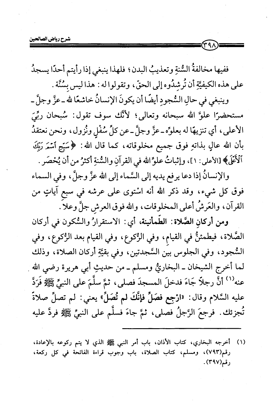 ففيها مخالفة السنة وتعذيب البدن، فلهذا ينبغي إذا رأيتم أحدا يسجد علي هذه الكيفية أن ترشدوه إلى الحق، وتقولوا له: هذا ليس بسنة. وينبغي في حال السجود أيضا أن يكون الإنسان خاشعا لله _ عز وجل_ مستحضرا علو الله سبحانه وتعالى، لأنك سوف تقول: سبحان ربي الأعلى، أي تنزيها له بعلوه_ عز وجل_ عن كل سفل ونزول، ونحن نعتقد بان الله عال بذاته فوق جميع مخلوقاته، كما قال الله: (سَبِّحِ اسْمَ رَبِّكَ الْأَعْلَى) (الأعلى: 1) ، واثبات علو الله في القران والسنة اكثر من أن يحضر. والإنسان إذا دعا يرفع يديه إلى السماء إلى الله عز وجل، وفي السماء فوق كل شئ، وقد ذكر الله أن استوي علي عرشه في سبع آيات من القران، والعرش اعلي المخلوقات، والله فوق العرش جلا وعلا. ومن أركان الصلاة: الطمأنينة، أي:
