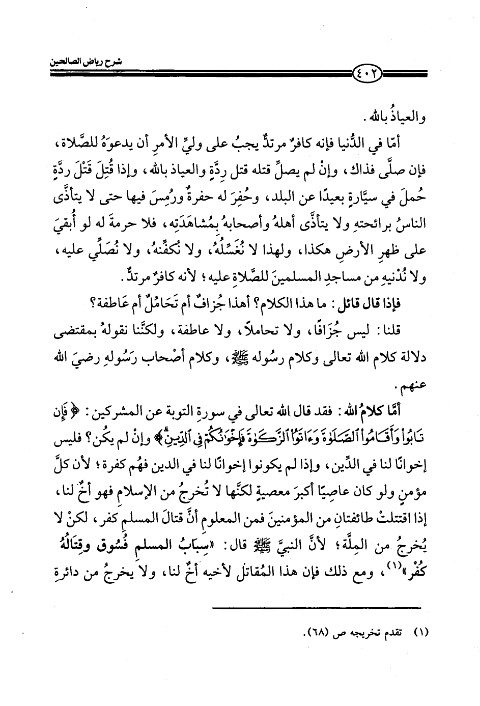 والعياذ بالله أما في الدنيا فانه كافر مرتد يجب علي ولي الأمر أن يدعوه للصلاة، فان صلي فذاك، وان لم يصل قتله قتل ردة والعياذ بالله، وإذا قتل قتل ردة حمل في سيارة بعيدا عن البلد، وحفر له حفرة ورمس فيها حتى لا يتأذى الناس برائحته ولا يتأذى أهله وأصحابه بمشاهدته، فلا حرمة له لو ابقي علي وجه الأرض هكذا، ولهذا لا نغسله، ولا نكفنه، ولا نصلي عليه، ولا ندنيه من مساجد المسلمين للصلاة عليه، لأنه كافر مرتد. فإذا قال قائل: ما هذا الكلام؟ أهذا جزاف أم تحامل أم عاطفة؟ قلنا: ليس جزافا، ولا تحاملا، ولا عاطفة، ولكننا نقول بمقتضى دلالة كلام الله تعالى وكلام رسوله صلي الله عليه وسلم وكلام أصحاب رسوله رضي الله عنهم. أما كلام الله: فقد قال الله تعالى في سورة التوبة عن المشركين: (فَإِنْ تَابُوا وَأَقَامُوا الصَّلاةَ وَآتَوُا الزَّكَاةَ فَإِخْوَانُكُمْ فِي الدِّينِ) (التوبة: من الآية11) وان لم يكن؟ فليس أخوانا لنا في الدين، وإذا لم يكونوا أخوانا لنا في الدين فهم كفرة، لان كل مؤمن ولو كان عاصيا اكبر معصية لكنها لا