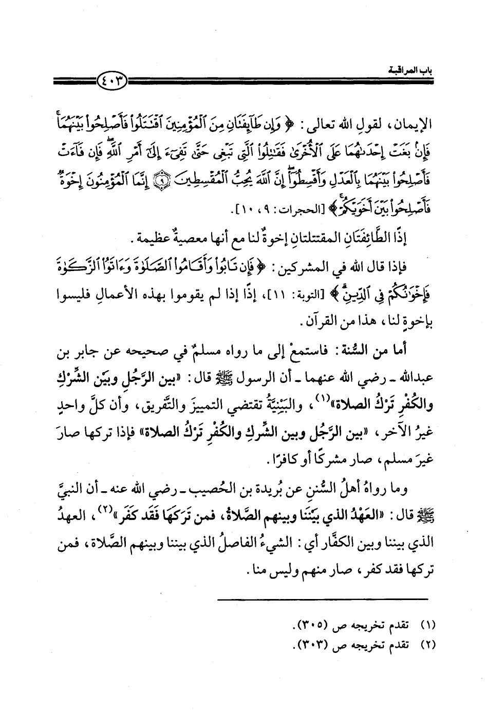 الإيمان، لقول الله تعالى: (وَإِنْ طَائِفَتَانِ مِنَ الْمُؤْمِنِينَ اقْتَتَلُوا فَأَصْلِحُوا بَيْنَهُمَا فَإِنْ بَغَتْ إِحْدَاهُمَا عَلَى الْأُخْرَى فَقَاتِلُوا الَّتِي تَبْغِي حَتَّى تَفِيءَ إِلَى أَمْرِ اللَّهِ فَإِنْ فَاءَتْ فَأَصْلِحُوا بَيْنَهُمَا بِالْعَدْلِ وَأَقْسِطُوا إِنَّ اللَّهَ يُحِبُّ الْمُقْسِطِينَ) (الحجرات: من الآية9) إذا الطائفتان المقتتلتان اخوة لنا مع إنها معصية عظيمة. فإذا قال الله في المشركين: (فَإِنْ تَابُوا وَأَقَامُوا الصَّلاةَ وَآتَوُا الزَّكَاةَ فَإِخْوَانُكُمْ فِي الدِّينِ) (التوبة: من الآية11) ، إذا إذا لم يقوموا بهذه الأعمال فلسوا باخوة لنا، هذا من القران أما من السنة: فاستمع إلى ما رواه مسلم في صحيحه عن جابر ابن عبد الله_ رضي الله عنهما_ أن الرسول صلي الله عليه وسلم قال: ((بين الرجل وبين الشرك ترك الصلاة)) (،) والبينية تقتضي