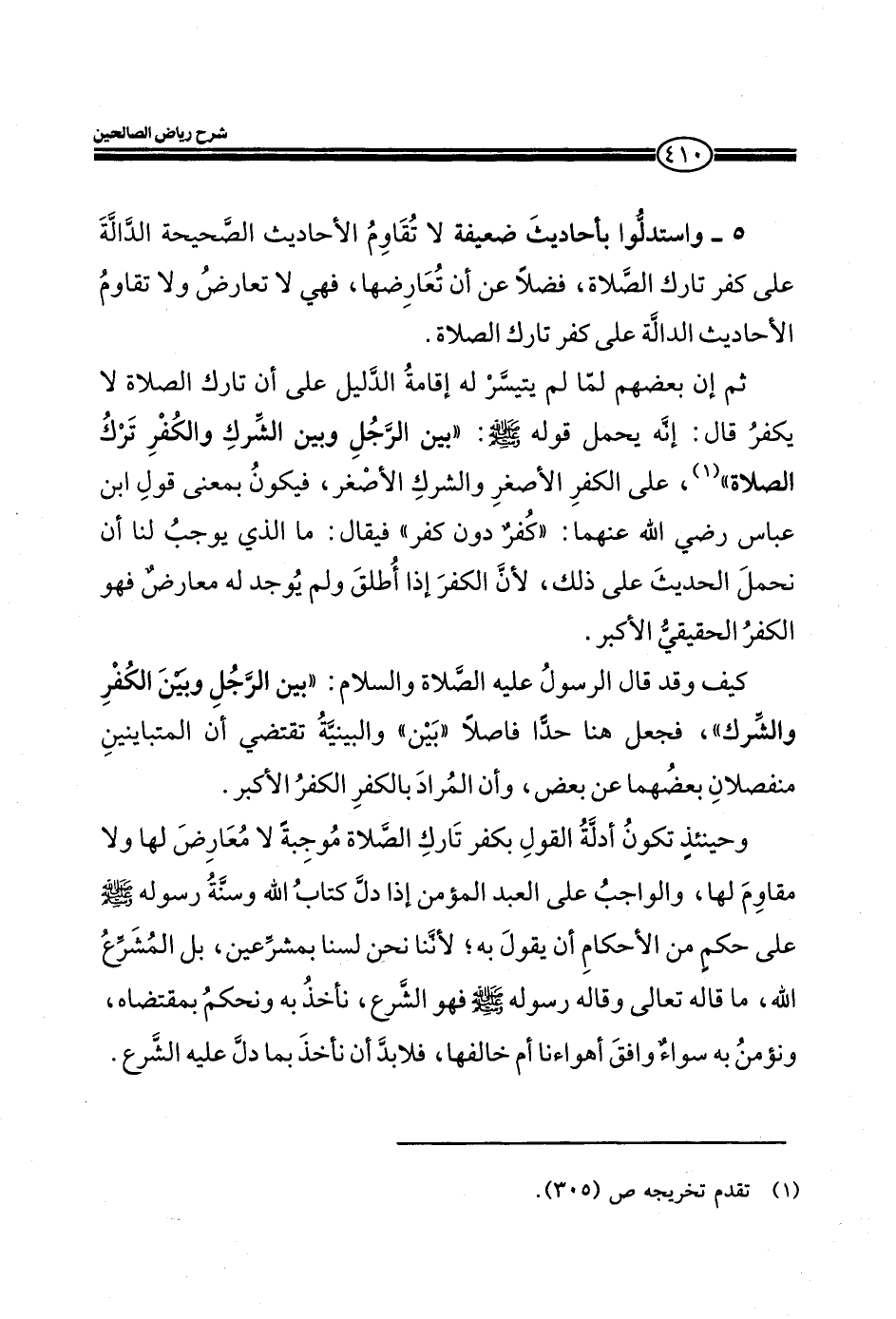 5_ واستدلوا بأحاديث ضعيفة لا تقاوم الأحاديث الصحيحة الدالة علي كفر تارك الصلاة، فضلا عن أن تعارضها، فهي لا تعارض ولا تقاوم الأحاديث الدالة علي كفر تارك الصلاة. ثم أن بعضهم لم يتيسر له إقامة الدليل علي أن تارك الصلاة لا يكفر قال: انه يحمل قوله صلي الله عليه وسلم: ((بين الرجل وبين الشرك والكفر ترك الصلاة)) ، علي الكفر الأصغر والشرك الأصغر، فيكون بمعني قول ابن عباس رضي الله عنهما: ((كفر دون كفر)) فيقال: ما الذي يوجب لنا أن نحمل الحديث علي ذلك، لان الكفر إذا أطلق ولم يوجد له معارض فهو الكفر الحقيقي الأكبر. كيف وقد قال الرسول عليه الصلاة والسلام: ((بين الرجل وبين الكفر والشرك)) ، فجعل هنا حدا فاصلا ((بين)) والبينية تقتضي المتباينين منفصلان بعضهما عن بعض، وان المراد بالكفر الكفر الأكبر. وحيئذ تكون أدلة القول بكفر تارك الصلاة موجبة لا معارض لها ولا مقاوم لها، والواجب علي العبد المؤمن إذا دل كتاب الله وسنة رسوله صلي الله عليه وسلم علي حكم من الأحكام أن يقول به، لأننا نحن ليس بمشرعين، بل المشرع الله، ما قاله تعالى وما قاله رسوله صلي الله عليه وسلم فهو الشرع، نأخذ به ونحكم بمقتضاه،