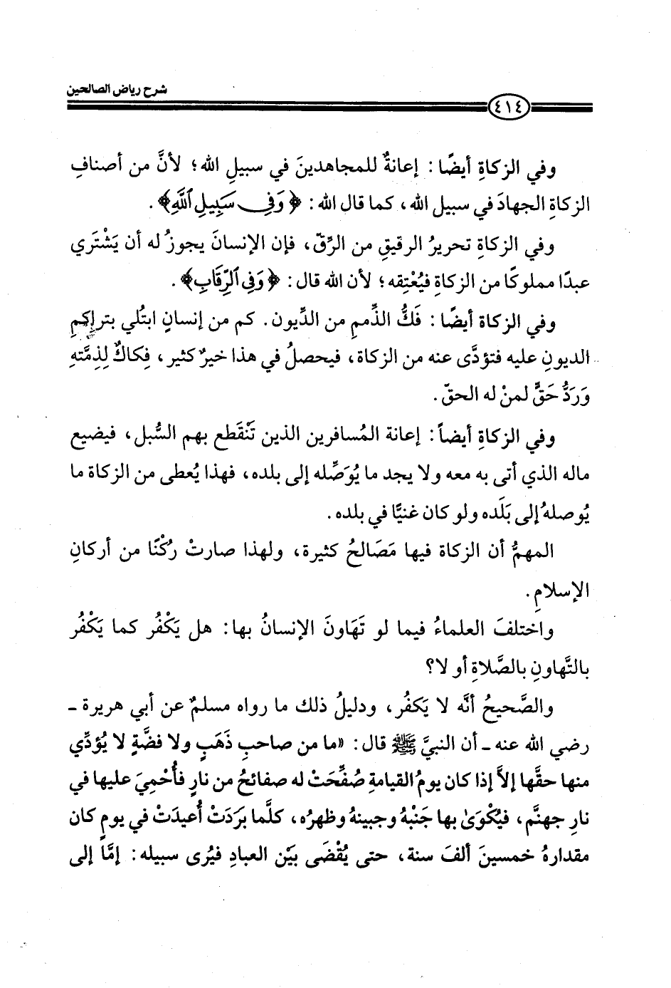 وفي الزكاة أيضا: أعانه للمجاهدين في سبيل الله، لان من أصناف الزكاة الجهاد في سبيل الله، كما قال الله: (وَفِي سَبِيلِ اللَّهِ) (التوبة: من الآية60) وفي الزكاة تحرير الرقيق من الرق، فان الإنسان يجوز له أن يشتري عبدا مملوكا من الزكاة فيعتقه، لان الله قال: (? وَفِي الرِّقَابِ) (التوبة: من الآية60) وفي الزكاة أيضا: فك اذمم من الديون. كم من إنسان ابتلي بتراكم الديون عليه فتؤدي عنه من الزكاة، فيحصل في هذا خير كثير، فكاك لذمته ورد حق لمن له الحق. وفي الزكاة أيضا: إعانة المسافرين الذين تنقطع بهم السبل، فيضيع ماله الذي أتى به معه ولا يجد ما يوصله إلى بلده، فهذا يعطي من الزكاة مل يوصله إلى بلده ولو كان غنيا في بلده. المهم أن الزكاة فيها مصالح كثيرة، ولهذا صارت ركنا من أركان الإسلام. واختلف العلماء فيما لو تهاون الإنسان بها: هل يكفر كما يكفر بالتهاون بالصلاة أو لا؟ والصحيح انه لا يكفر، ودليل ذلك ما رواه مسلم عن أبي هريرة_ رضي الله عنه_ أن النبي صلي الله عليه وسلم قال: ((ما من صاحب ذهب ولا فضة لا يؤدي منها حقها إلا إذا كان يوم القيامة صفحي له صفائح من نار فاحمي عليها في نار جهنم، فيكوي بها جنبه