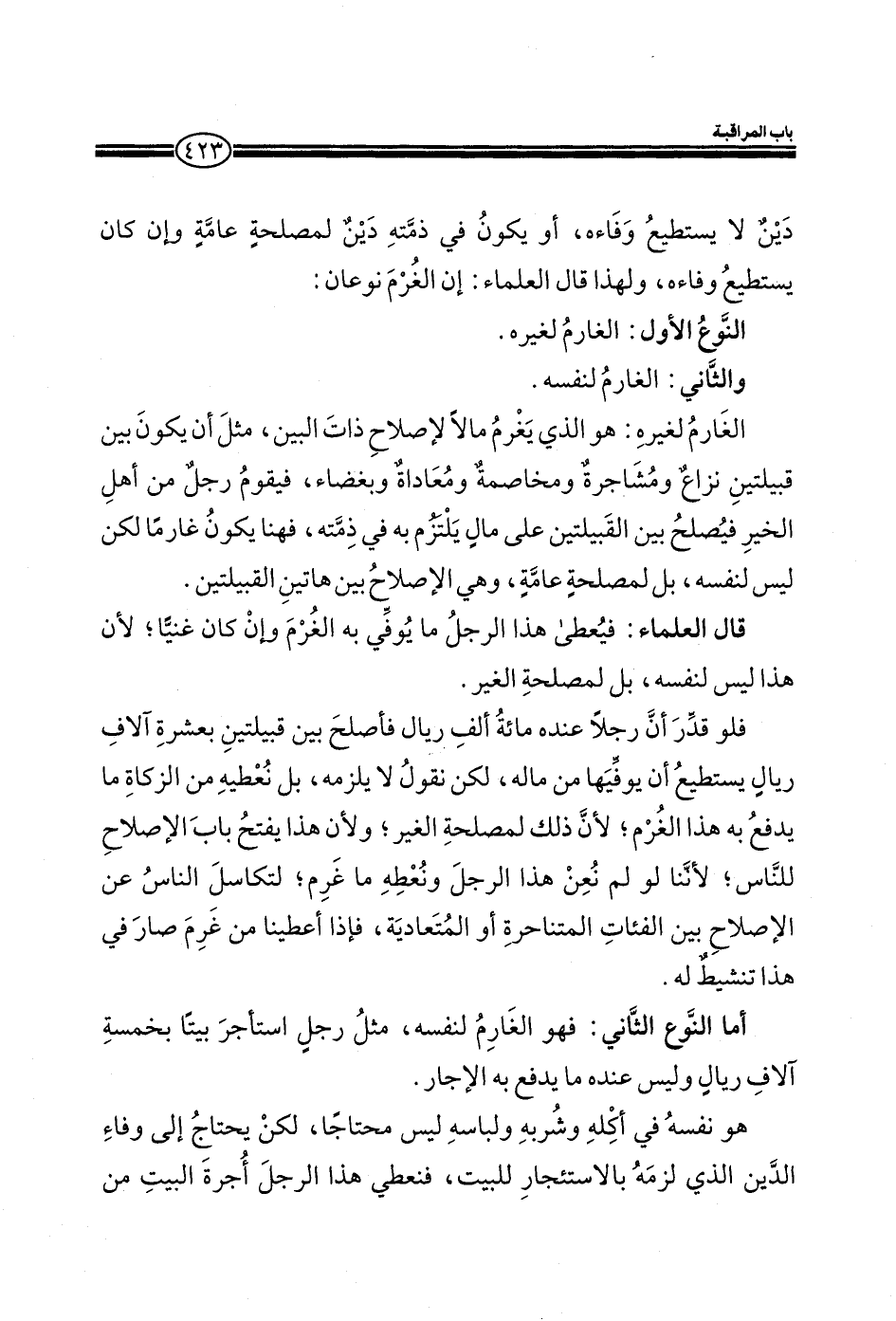 لنفسه، بل لمصلحة عامة، وهي الإصلاح بين هاتين القبيلتين. قال العلماء: فيعطي هذا الرجل ما يوفي به من العزم وان كان غنيا، لان هذا ليس لنفسه، بل لمصلحة الغير. فلو قدر أن رجلا عنده مائة ألف فاصلح بين قبيلتين بعشرة آلاف ريال يستطيع أن يوفيها من ماله، لكن نقول لا يلزمه، بل نعطيه من الزكاة ما يدفع به هذا الغرم، لان ذلك لمصلحة الغير، ولان هذا يفتح باب الإصلاح للناس، لأننا لو لم نعن هذا الرجل ونعطه ما غرم، لتكاسل الناس عن الإصلاح بين الفئات المتناحرة أو المتعادية، فإذا أعطينا من غرم فيكون هذا تنشيط له. أما النوع الثاني: فهو الغارم لنفسه، مثل رجل استأجر بيتا بخمسة آلاف ريال وليس عنده ما يدفع به الاجار. هو نفسه في أكله وشربه ولباسه ليس محتاجا، لكن يحتاج إلى وفاء الدين الذي لزمه بالاستئجار للبيت، فنعطي هذا الرجل أجرة البيت من