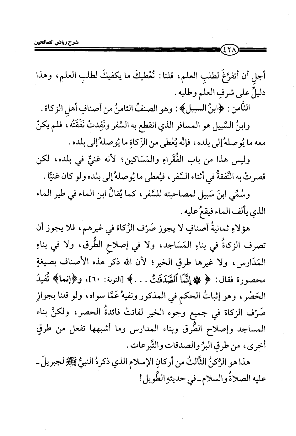 اجل أن أتفرغ لطلب العلم، قلنا: نعطيك ما يكفيك لطلب العلم، وهذا دليل علي شرف العلم وطلبه. الثامن: (ابْنِ السَّبِيلِ) (التوبة: من الآية60) : وهو الصنف الثامن من أصناف أهل الزكاة. وابن السبيل هو المسافر الذي انقطع به السفر ونفدت نفقته، فلم يكن معه ما يوصله إلى بلده. وليس هذا من باب الفقراء والمساكين، لأنه غني في بلده، لكن قصرت به النفقة في أثناء السفر، فيعطي ما يوصله إلى بلده ولو كان غنيا. وسمي ابن سبيل لمصاحبته للسفر، كما يقال ابن الماء في طير الماء الذي يألف الماء فيقع عليه. هؤلاء ثمانية أصناف لا يجوز صرف الزكاة في غيرهم، فلا يجوز أن تصرف الزكاة في بناء المساجد، ولا في إصلاح الطرق، ولا في بناء المدارس، ولا غيرها طرق الخير، لان الله ذكر هذه الأصناف بصيغة محصورة فقال: (إِنَّمَا الصَّدَقَاتُ) (التوبة: من الآية60) و (إِنَّمَا) (التوبة: من الآية60) تفيد الحصر، وهو إثبات الحكم في الذكور ونفيه عما سواه، ولو قلنا بجواز صرف الزكاة في جميع وجوه الخير لفاتت فائدة الحصر، ولكن بناء