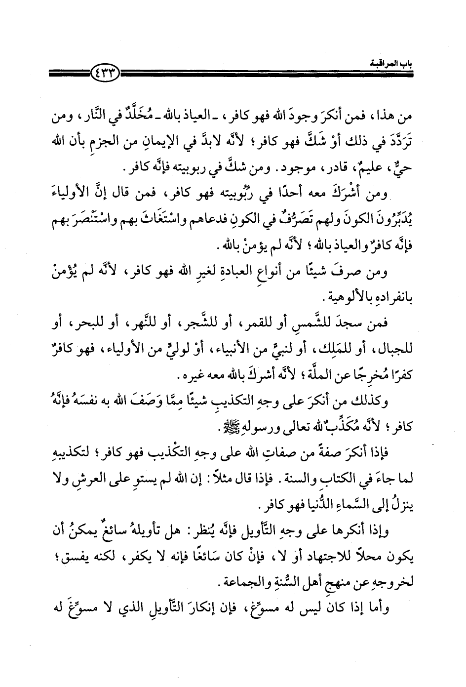 مخلد في النار، ومن تردد في ذلك أو شك فهو كافر، لأنه لا بد في الإيمان من الجزم بان الله حي، عليم، قادر، موجود. ومن شك في ربو بيته فانه كافر. ومن أشرك معه أحد في ربو بيته فهو كافر، ومن قال أن الأولياء يدبرون الكون ولهم تصرف في الكون ودعاهم واستغاث بهم وانتصر بهم فانه كافر والعياذ بالله، لأنه لم يؤمن بالله. ومن صرف شيئا من أنواع العبادة لغير الله فهو كافر، لأنه لم يؤمن بانفراده بالألوهية. فمن سجد للشمس أو القمر، أو للشجر، أو للنهر، أو للبحر، أو للجبال، أو للملك، أو لنبي من الأنبياء، أو لولي من الأولياء، فهو كافرا كفرا مخرجا عن الملة، لأنه أشرك بالله معه غيره. وكذلك من أنكر على وجه التكذيب شيئا مما وصف الله به نفسه فانه كافر، لأنه مكذب لله تعالى ورسوله صلى الله عليه وسلم. فإذا أنكر صفة من صفات الله على وجه التكذيب فهو كافر، لتكذيبه لما جاء في الكتاب والسنة. فإذا قال مثلا: أن الله لم يستو على العرش ولا ينزل إلى السماء الدنيا فهو كافر. وإذا أنكرها على وجه التأويل فانه ينظر: هل تأويله سائغ يمكن أن يكون محل للاجتهاد أو لا، فان كان سائغا فانه لا يكفر، لكنه يفسق، لخروجه عن منهج