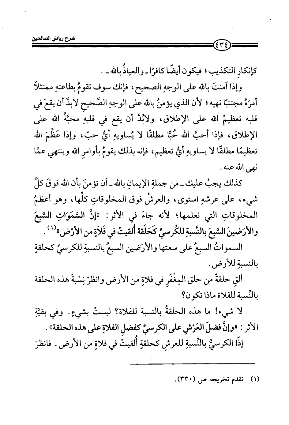 كإنكار التكذيب، فيكون أيضا كافرا- والعياذ بالله-. وإذا آمنت بالله على الوجه الصحيح، فانك سوف تقوم بطاعته ممتثلا أمره مجتنبا نهيه، لان الذي يؤمن بالله علي الوجه الصحيح، لابد أن يقع في قلبه تعظيم الله علي الإطلاق، ولابد أن يقع في قلبه محبة الله علي الإطلاق، فإذا احب الله حبا مطلقا لا يساوي أي حب، وإذا عظم تعظيما مطلقا لا يساويه أي تعظيم، فانه بذلك يقوم بأوامر الله وينتهي عما نهي الله عنه. كذلك يجب عليك_ من جملة الإيمان بالله_ أن تؤمن بان الله فوق كل شئ، علي عرشه استوي، والعرش فوق المخلوقات كلها، وهو اعظم المخلوقات التي نعلمها، لأنه جاء في الأثر: ((أن السماوات السبع والأرضيين السبع بالنسبة للكرسي كحلقة ألقيت في فلاة من الأرض)) السماوات السبع علي سعتها والأرضيين السبع بالنسبة للكرسي كحلقة بالنسبة للأرض. الق حلقة من حلق المغفر في فلاة من الأرض وانظر نسبة هذه الحلقة بالنسبة للفلاة ماذا تكون؟ لا شئ! وهذه الحلقة بالنسبة للفلاة؟ ليست بشيء. وفي بقية الأثر: ((وان فضل العرش علي الكرسي كفضل الفلاة علي هذه