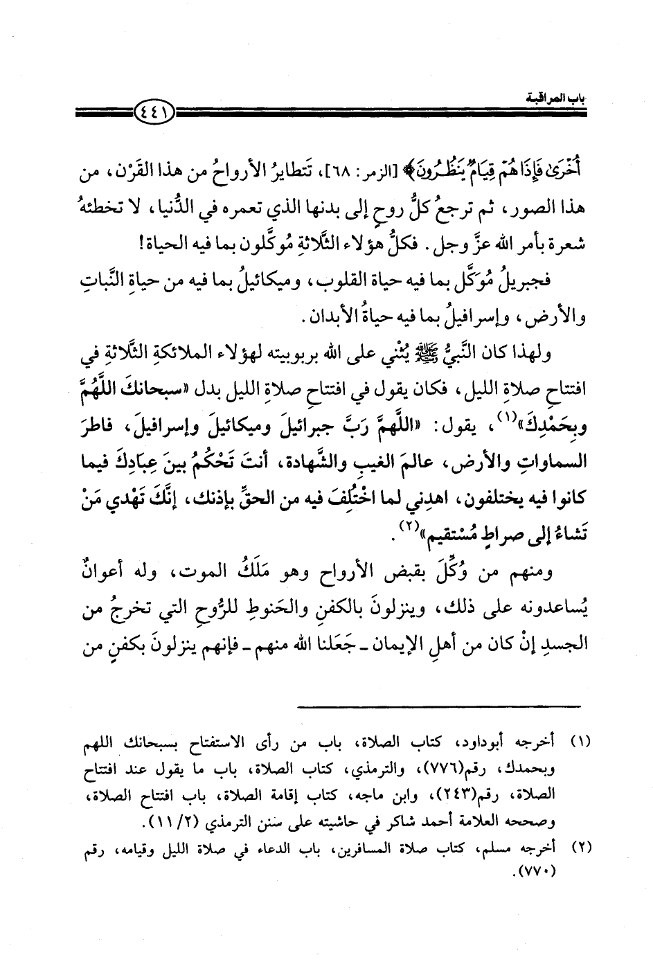حياة الأبدان. ولهذا كان النبي صلي الله عليه وسلم يثني علي الله بربو بيته لهؤلاء الملائكة الثلاثة في افتتاح صلاة الليل، فكان يقول في افتتاح صلاة الليل بدل ((سبحانك اللهم وبحمدك)) ، يقول: ((اللهم رب جبريل وميكائيل واسرافيل، فاطر السماوات والأرض، عالم الغيب والشهادة، أنت تحكم بين عبادك قيما كانوا فيه يختلفون، اهدني لما اختلف فيه من الحق بإذنك، انك تهدي من تشاء إلى صراط مستقيم)) . ومنهم من وكل بقبض الأرواح وهو ملك الموت، وله أعوان يساعدونه علي ذلك، وينزلون بالكفن والحنوط للروح التي تخرج من الجسد إن كان من أهل الإيمان_ جعلنا الله منهم_ فانهم ينزلون بكفن من
