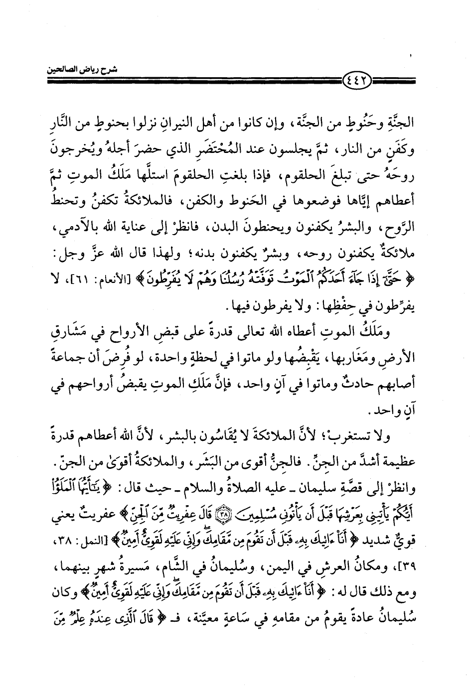 رُسُلُنَا وَهُمْ لا يُفَرِّطُونَ) (الأنعام: من الآية61) ، لا يفرطون في حفظها: ولا يفرطون فيها. وملك الموت أعطاه الله تعالى قدرة علي قبض الأرواح في مشارق الأرض ومغاربها، يقبضها ولو ماتوا في لحظة واحدة، لو فرض إن جماعة أصابهم حادث وماتوا في إن واحد، فان ملك الموت يقبض أرواحهم في إن واحد. ولا تستغرب، لان الملائكة لا يقاسون بالبشر، لان الله أعطاهم قدرة عظيمة اشد من الجن. فالجن اقوي من البشر، والملائكة اقوي من الجن. وانظر إلى قصة سليمان_ عليه الصلاة والسلام_ حيث قال: (قَالَ يَا أَيُّهَا الْمَلَأُ أَيُّكُمْ يَأْتِينِي بِعَرْشِهَا قَبْلَ أَنْ يَأْتُونِي مُسْلِمِينَ قَالَ عِفْرِيتٌ مِنَ الْجِنِّ) (النمل: من الآية39) عفريت يعني قوي شديد (أَنَا آتِيكَ بِهِ قَبْلَ أَنْ تَقُومَ مِنْ مَقَامِكَ وَإِنِّي عَلَيْهِ لَقَوِيٌّ أَمِينٌ) (النمل: من الآية39) وكان سليمان عادة يقوم من مقامه في ساعة معينة، ف (قَالَ الَّذِي عِنْدَهُ عِلْمٌ مِنَ