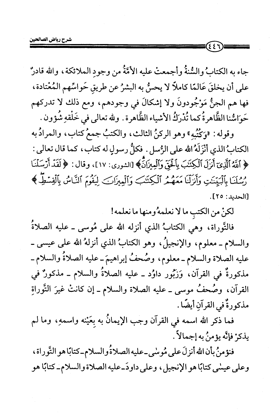 الظاهرة كما تدرك الأشياء الظاهرة. ولله تعالى في خلقه شؤون. وقوله: (وَكُتُبِهِ) وهو الركن الثالث، والكتب جمع كتاب، والمراد به الكتاب الذي أنزله الله علي الرسل. فكل رسول له كتاب، كما قال تعالى (اللَّهُ الَّذِي أَنْزَلَ الْكِتَابَ بِالْحَقِّ وَالْمِيزَانَ) (الشورى: من الآية17) ، وقال: (لَقَدْ أَرْسَلْنَا رُسُلَنَا بِالْبَيِّنَاتِ وَأَنْزَلْنَا مَعَهُمُ الْكِتَابَ وَالْمِيزَانَ لِيَقُومَ النَّاسُ بِالْقِسْطِ) (الحديد: من الآية25) . لكن من لا كتب ما لا نعلمه ومنها ما لا نعلمه! فالتوراة، وهي الكتاب الذي انزل الله علي موسى_ عليه الصلاة والسلام_ معلوم، والإنجيل، وهو الكتاب الذي أنزله الله علي عيسى_ عليه الصلاة والسلام_ معلوم، وصحف إبراهيم_ عليه الصلاة والسلام_ مذكورة في القران، وزبور داود_ عليه الصلاة والسلام_ مذكور في القران، وصحف موسى_ عليه الصلاة والسلام_ إن كانت غير التوراة مذكورة في القران أيضا. فما ذكر الله اسمه في القران وجب الإيمان به بعينه واسمه، وما لم يذكر فانه يؤمن به إجمالا. فنؤمن بان الله انزل علي موسى_ عليه الصلاة والسلام_ كتابا هو التوراة، وعلي عيسي كتابا هو الإنجيل، وعلي داود