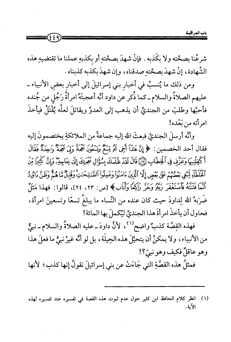 شرعنا بصحته ولا بكذبه. فان شهد بصحته أو بكذبه عملنا ما تقتضيه هذه الشهادة، إن شهد بصحته صدقناه، وان شهد بكذبه كبناه. ومن ذلك ما ينسب في أخبار بني إسرائيل إلى أخبار بعض الأنبياء_ عليهم الصلاة والسلام_ كما ذكر عن داود انه أعجبته امرأة رجل من جنده وطلب من الجندي إن يذهب إلى العدو ويقاتل لعله يقتل فيأخذ امرأته من بعده! وانه أرسل الجندي فبعث الله إليه جماعة من الائكة يختصمون إليه فقال