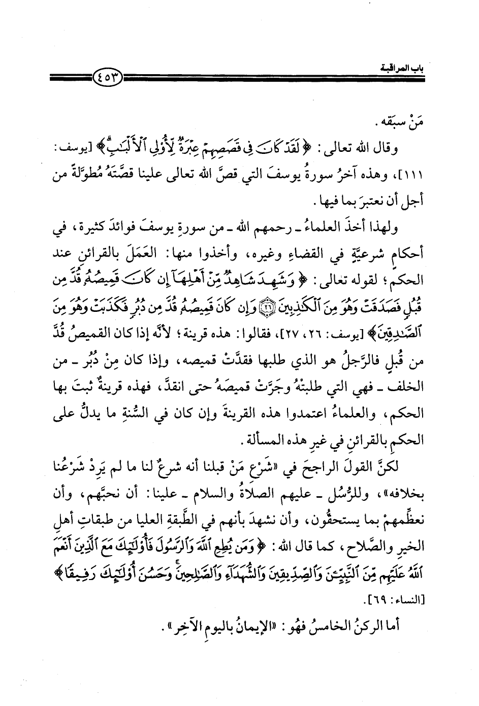 اعتمدوا هذه القرينة وان كان في السنة ما يدل علي الحكم بالقرائن في غير هذه المسالة. لكن القول الراجح في ((شرع من قبلنا ما لم يرد شرعنا بخلافه)) ، وللرسل_ عليهم الصلاة والسلام_ علينا: إن نحبهم، وان نعظمهم بما يستحقون، وان نشهد بأنهم في الطبقة العليا من طبقات أهل الخير والصلاح، كما قال الله: (وَمَنْ يُطِعِ اللَّهَ وَالرَّسُولَ فَأُولَئِكَ مَعَ الَّذِينَ أَنْعَمَ اللَّهُ عَلَيْهِمْ مِنَ النَّبِيِّينَ وَالصِّدِّيقِينَ وَالشُّهَدَاءِ وَالصَّالِحِينَ وَحَسُنَ أُولَئِكَ رَفِيقاً) (النساء: 69) . أما الركن الخامس فهو: ((الإيمان باليوم الآخر)) .