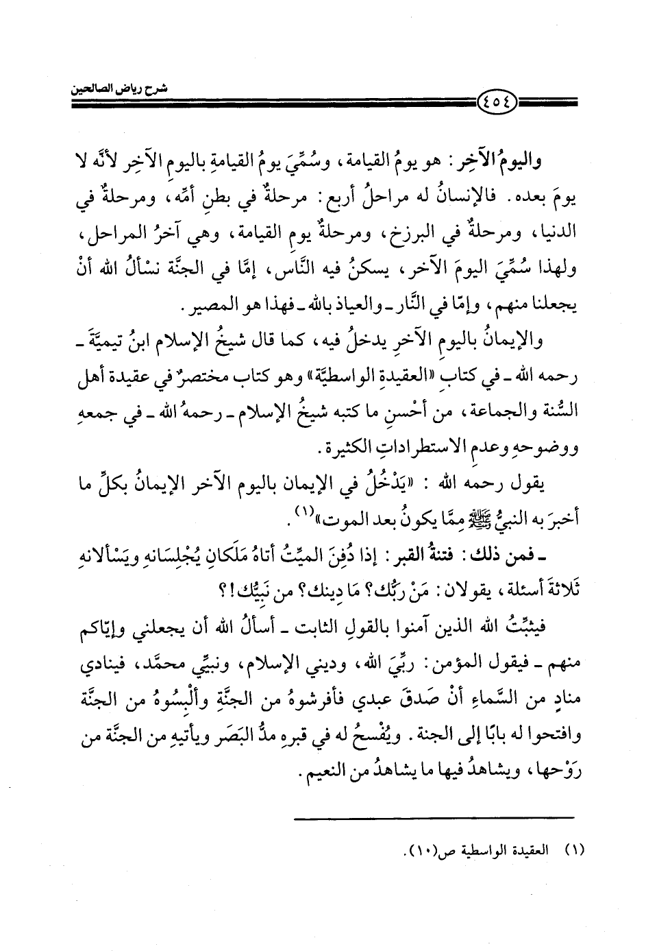 السنة والجماعة، من احسن ما كتبه شيخ الإسلام_ رحمه الله_ في جمعه ووضوحه وعدم الاستطرادات الكثيرة. يقول رحمه الله: يدخل في الإيمان باليوم الآخر الإيمان بكل ما اخبر به النبي صلي الله عليه وسلم مما يكون بعد الموت)) _ فمن ذلك: فتنة القبر: إذا دفن الميت أتاه ملكان يجلسانه ويسألانه ثلاثة أسئلة، يقولان: من ربك؟ ما دينك؟ من نبيك!؟