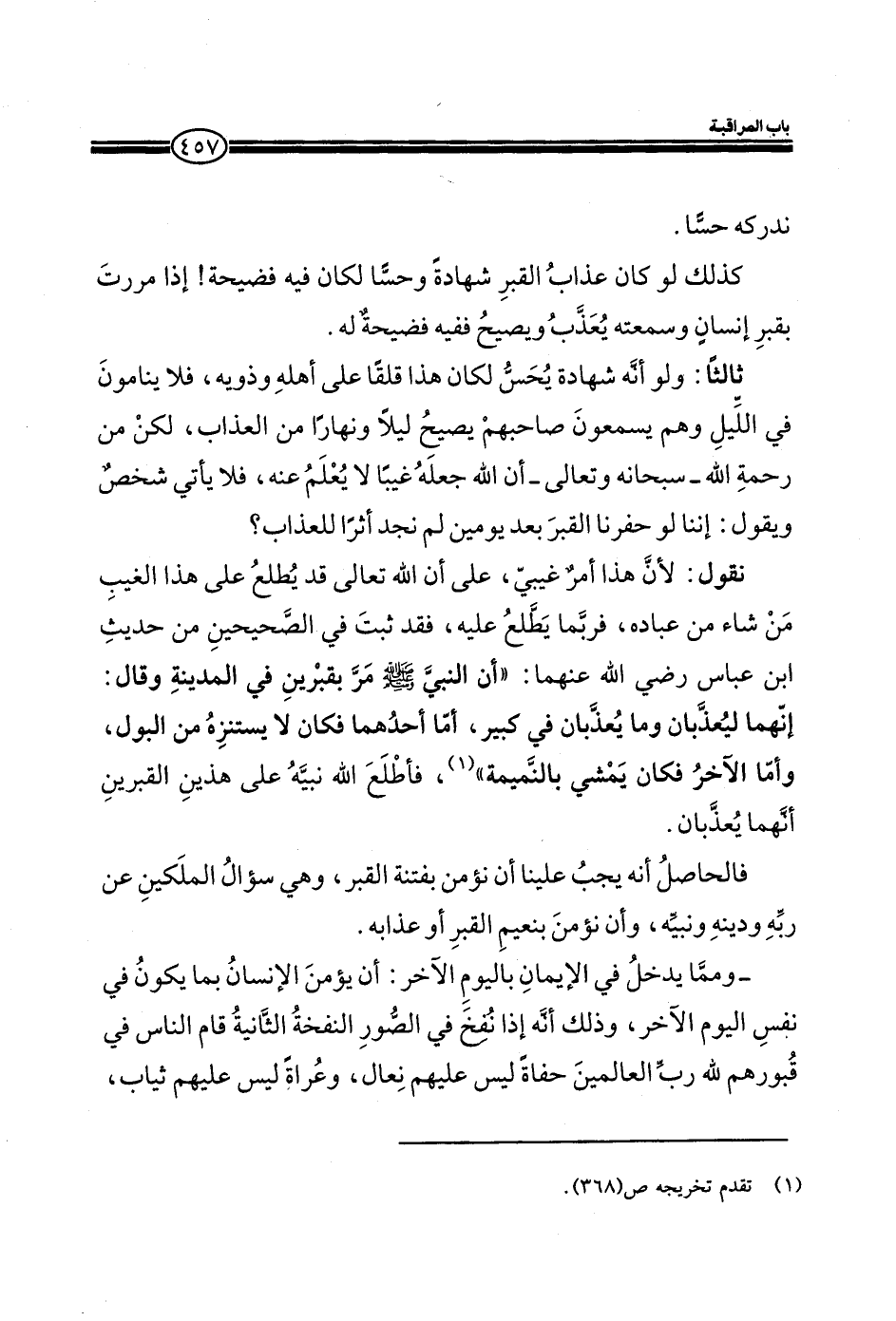 ندركه حسا. كذلك لو كان عذاب القبر شهادة وحسا لكان فيه فضيحة! إذا مررت بقبر إنسان وسمعته يعذب ويصيح ففيه فضيحة له. ثالثا: ولو أن شهادة يحس لكان هذا قلقا علي أهله وذويه، فلا ينامون في الليل وهم يسمعون صاحبهم يصيح ليلا ونهارا من العذاب، لكن من رحمة الله_ سبحانه وتعالى_ أن الله جعله غيبا لا يعلم عنه، فلا يأتي شخص ويقول: أننا لو حفرنا القبر بعد يومين لم نجد أثرا للعذاب؟ نقول: لان هذا أمر غيبي، علي أن الله تعالى قد يطلع علي هذا الغيب من شاء من عباده، فربما يطلع عليه، فقد ثبت في الصحيحين من حديث ابن عباس رضي الله عنهما: ((أن النبي صلي الله عليه وسلم مر بقبرين في المدينة وقال: انهما ليعذبان وما يعذبان في كبيرة، أما أحدهما فكان لا يستنزه من البول، وأما الآخر فكان يمشي بالنميمة)) ، فاطلع الله نبيه علي هذين القبرين انهما يعذبان فالحاصل انه يجب علينا أن نؤمن بفتنة القبر، وهي سؤال الملكين عن ربه ودينه ونبيه، وان نؤمن بنعيم القبر لو عذابه، _