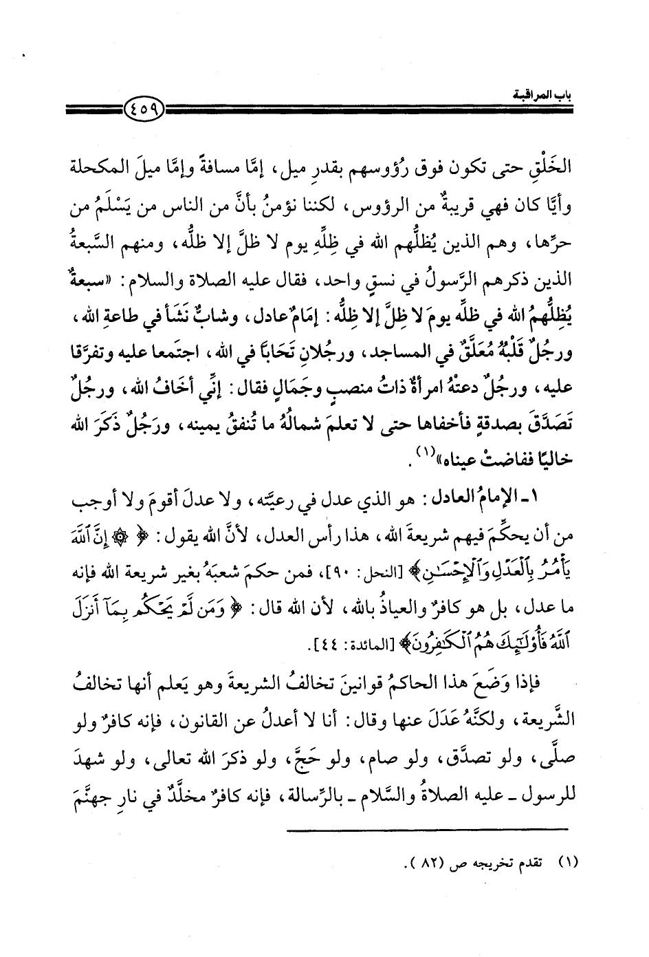 ورجل دعته امرأة ذات منصب وجمال فقال: أني أخاف الله، ورجل تصدق بصدقة فأخفاها حتى لا تعلم شماله ما تنفق يمينه، ورجل ذكر الله خاليا ففاضت عيناه)) الإمام العادل: هو الذي عدل في رعيته، ولا عدل اقوم ولا أوجب من أن يحكم فيهم شريعة الله، هذا راس العدل، لان الله يقول: (إِنَّ اللَّهَ يَأْمُرُ بِالْعَدْلِ وَالْأِحْسَانِ) (النحل: من الآية90) ، فمن حكم شعبه بغير شريعة الله فانه ما عدل، بل هو كافر والعياذ بالله، لان الله قال: (وَمَنْ لَمْ يَحْكُمْ بِمَا أَنْزَلَ اللَّهُ فَأُولَئِكَ هُمُ الْكَافِرُونَ) (المائدة: من الآية44) فإذا وضع هذا الحاكم قوانين تخالف الشريعة وهو يعلم إنها تخالف الشريعة، لكنه عدل عنها وقال: أنا لا اعدل عن القانون، فانه كافر وان صلي، ولو تصدق، ولو صام، ولو حج، ولو ذكر الله تعالى، ولو شهد للرسول_ عليه الصلاة والسلام_ بالرسالة، فانه كافر مخلد في جهنم