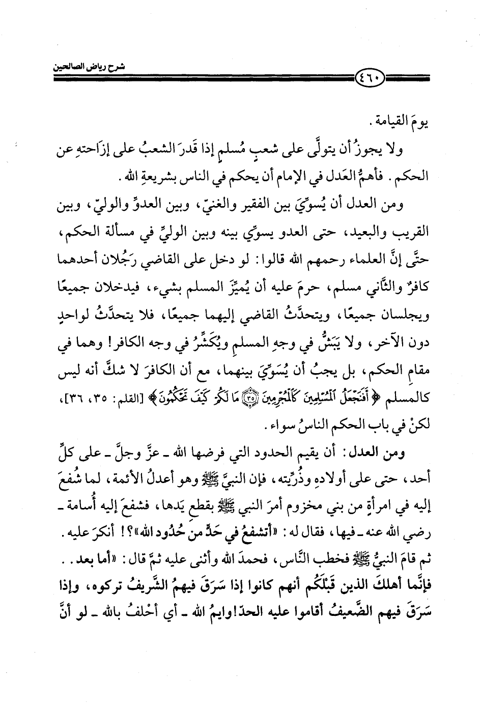 يوم القيامة ولا يجوز أن يتولى عن شعب مسلم إذا قدر الشعب علي إزاحته عن الحكم. فاهم العدل في الإمام أن يحكم في الناس بشريعة الله. ومن العدل أن يسوي بين الفقير والغني، وبين العدو والولي، وبين القريب والبعيد، حتى العدو يسوي بينه وبين