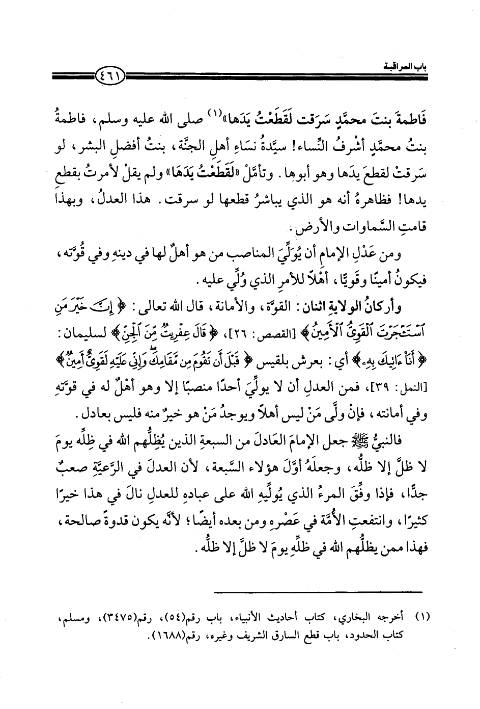 سرقت لقطع يدها وهو أبوها. وتأمل ((لقطعت يدها)) ولم يقل ل أمرت بقطع يدها! فظاهره هو الذي يباشر قطعها لو سرقت. هذا العدل، وبهذا قامت السماوات والأرض. ومن عدل الإمام أن يولي المناصب من هو أهل لها في دينه وفي قوته، فيكون أمينا وقويا، أهلا للأمر الذي ولي عليه. وأركان الولاية اثنان: القوة، والأمانة، قال الله تعالى: (قَالَ عِفْرِيتٌ مِنَ الْجِنِّ) (النمل: من الآية39) إِنَّ خَيْرَ مَنِ اسْتَأْجَرْتَ الْقَوِيُّ الْأَمِينُ) (القصص: من الآية26) لسليمان: (ِ أَنَا آتِيكَ بِهِ) (النمل: من الآية39) أي: بعرش بلقيس (قَبْلَ أَنْ تَقُومَ مِنْ مَقَامِكَ وَإِنِّي عَلَيْهِ لَقَوِيٌّ أَمِينٌ) (النمل: من الآية39) ، فمن العدل أن لا يولي أحدا منصبا ألا وهو أهل له في قوته وفي أمانته، فان ولي من ليس أهلا ويوجد من هو خير منه فليس بعادل. فالنبي صلي الله عليه وسلم جعل الإمام العادل من السبعة الذين يظلهم الله في ظله يوم لا ظل إلا ظله، وجعله أول هؤلاء السبعة، لان العدل في الرعية صعب جدا، فإذا وفق المرء الذي يوليه الله علي عباده للعدل أن في هذا خيرا كثيرا، وانتفعت الأمة في عصره ومن بعده أيضا، لأنه يكون قدوة صالحة،