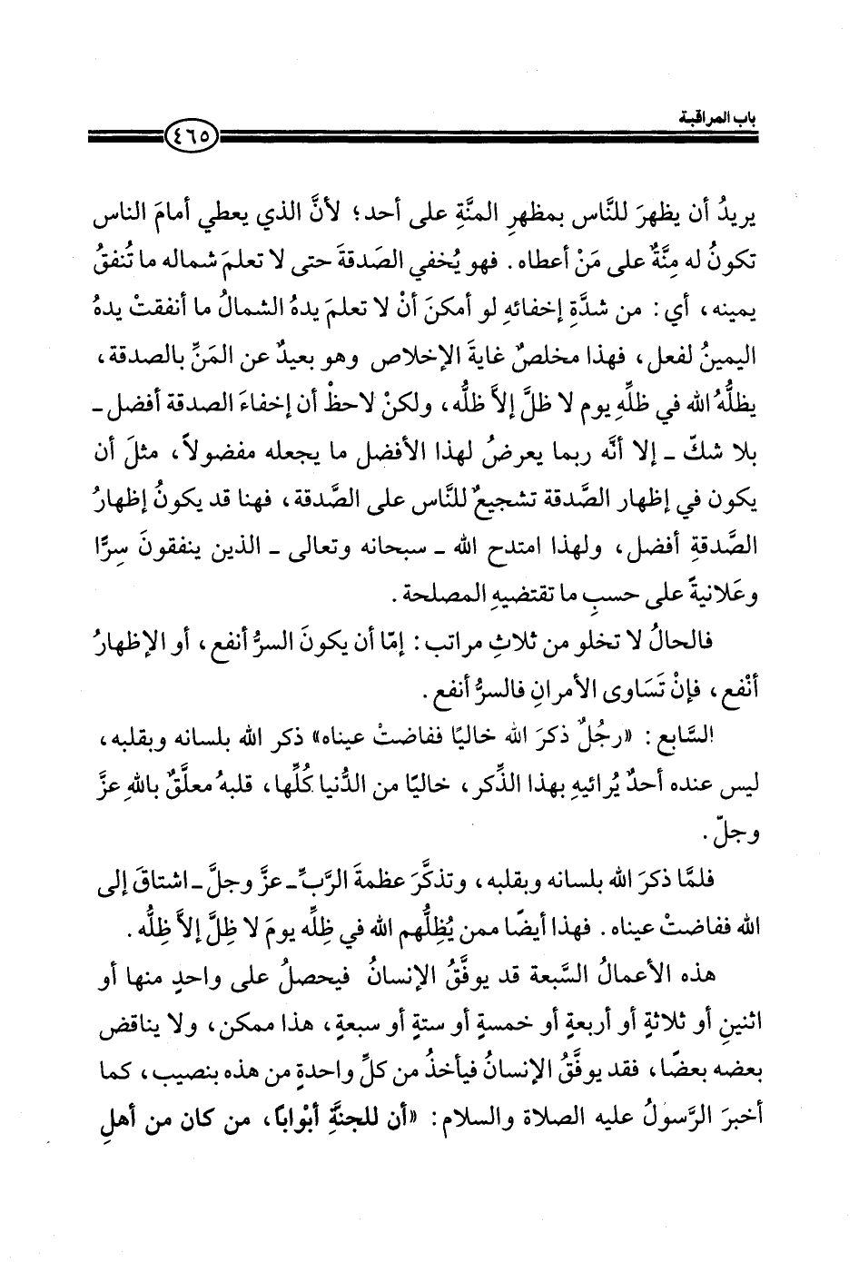 الله في ظله يوم لا ظل الاظله، ولكن لاحظ أن إخفاء الصدقة افضل_ بلا شك_ إلا انه ربما يعرض لهذا الأفضل ما يجعله مفضولا، مثل أن يكون في إظهار الصدقة تشجيع للناس علي الصدقة، فهنا قد يكون إظهار الصدقة افضل، ولهذا امتدح الله_ سبحانه وتعالى_ الذين ينفقون سرا وعلانية علي حسب ما تقتضيه المصلحة. فالحال لا تخلوا من ثلاث مراتب: أما أن يكون السر انفع، أو الإظهار انفع، فان تساوي الأمران فالسر انفع. السابع: ((رجل ذكر الله خاليا ففاضت عيناه)) ذكر الله بلسانه وبقلبه، ليس عنده أحد يرائيه بهذا الذكر، خاليا من الدنيا كلها، قلبه معلق بالله عز وجل. فلما ذكر الله بلسانه وبقلبه، وتذكر عظمة الرب_ عز وجل_ اشتاق إلى الله ففاضت عيناه. فهذا أيضا ممن يظلهم الله في ظله يوم لا ظل إلا ظله. هذه الأعمال السبعة قد يوفق الإنسان فيحصل علي واحد منها أو اثنين أو ثلاثة أو أربعة أو خمسة أو ستة أو سبعة، هذا ممكن، ولا يناقض بعضه بعضا، فقد يوفق الإنسان فيأخذ من كل واحدة من هذه بنصيب، كما اخبر الرسول عليه الصلاة والسلام: ((أن للجنة أبوابا، من كان من أهل