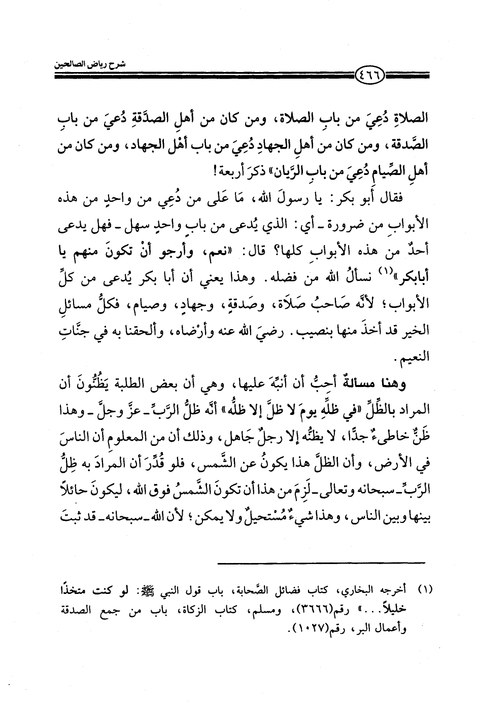 من أهل الجهاد دعي من باب الجهاد، ومن كان من أهل الصيام دعي من باب الريان)) ذكر أربعة! فقال أبو بكر: يا رسول الله، ما علي من دعي علي واحد من هذه الأبواب من ضرورة_ أي: الذي يدعي من باب واحد سهل_ فهل يدعي أحد من هذه الأبواب كلها؟ قال: ((نعم، وأرجو أن تكون منهم يا أبو بكر)) نسأل الله من فضله. وهذا يعني أن أبا بكر يدعي من كل الأبواب، لأنه صاحب صلاة، وصدقة، وجهاد، وصيام، فكل مسائل الخير قد اخذ منها بنصيب. رضي الله عنه وأرضاه، وألحقنا به في جنات النعيم. وهنا مسالة احب أن انبه عليها، وهي أن بعض الطلبة يظنون أن المراد بالظل ((في ظل يوم لا ظل إلا ظله)) انه ظل الرب_ عز وجل_ وهذا ظن خاطئ جدا، لا يظنه الأرجل جاهل، وذلك أن من المعلوم أن الناس في الأرض، وان الظل هذا يكون عن الشمس، فلو قدر أن المراد به ظل الرب_ سبحانه وتعالى_ لزم من هذا أن تكون الشمس فوق الله، ليكون حائلا بينها وبين الناس، وهذا شئ مستحيل ولا يمكن، لان الله_ سبحانه وتعالى_ قد ثبت