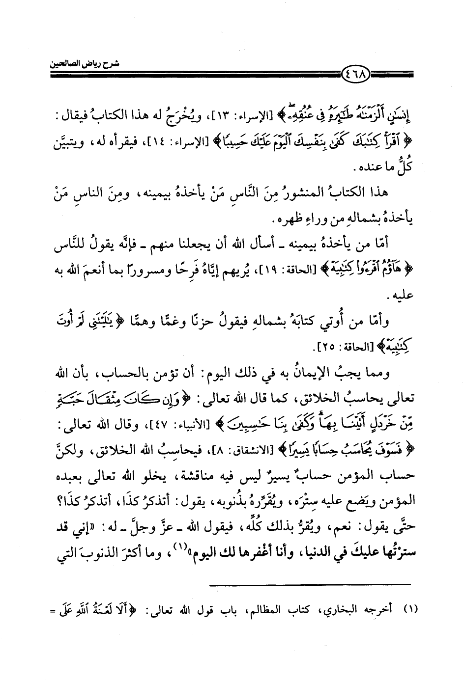 طَائِرَهُ فِي عُنُقِهِ) (الإسراء: من الآية13) ويخرج له هذا الكتاب فيقال: (اقْرَأْ كِتَابَكَ كَفَى بِنَفْسِكَ الْيَوْمَ عَلَيْكَ حَسِيباً) (الإسراء: 14) ، فيقراه له، ويتبين كل ما عنده. هذا الكتاب المنشور من الناس من يأخذه بيمينه، ومن الناس من يأخذه بشماله من وراء ظهره. أما من يأخذه بيمينه_ أسال الله أن يجعلنا منهم_ فانه يقول للناس (هَاؤُمُ اقْرَأوا كِتَابِيَهْ) (الحاقة: من الآية19) ، يريهم إياه فرحا ومسرورا بما انعم الله به عليه. وأما من أوتى كتابه بشماله فيقول حزا وقما وهما (يَا لَيْتَنِي لَمْ أُوتَ كِتَابِيَهْ) (الحاقة: من الآية25) . ومما يجب الإيمان به في ذلك اليوم: أن تؤمن بالحساب، بان الله تعالى يحاسب الخلائق، كما قال الله تعالى: (وَإِنْ كَانَ مِثْقَالَ حَبَّةٍ مِنْ خَرْدَلٍ أَتَيْنَا بِهَا وَكَفَى بِنَا حَاسِبِينَ) (الأنبياء: من الآية47) ، وقال الله تعالى: (فَسَوْفَ يُحَاسَبُ حِسَاباً يَسِيراً) (الانشقاق: 8) ، فيحاسب الله الخلائق، ولكن حساب المؤمن حساب يسير ليس فيه مناقشة، يخلو الله سبحانه وتعالى بعبده المؤمن ويضع عليه ستره، ويقرره بذنوبه، يقول: أتذكر كذا؟ حتى يقول: نعم، ويقر