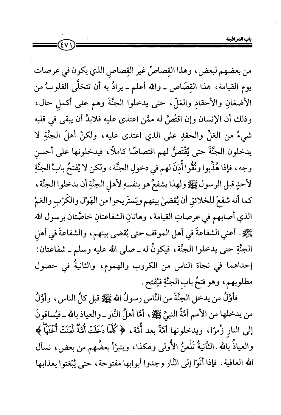 من بعضهم لبعض، وهذا القصاص غير القصاص الذي يكون في عر صات يوم القيامة، هذا لقصاص_ والله اعلم_ يراد به أن تتخلى القلوب من الأضغان والأحقاد والغل، حتى يدخلوا الجنة وهم علي اكمل حال، وذلك أن الإنسان وان اقتص له ممن اعتدي عليه فلا بد أن يبقي في قلبه شئ من الغل والحقد علي الذي اعتدي عليه، ولكن أهل الجنة لا يدخلون الجنة حتى يقتص لهم اقتصاصا كاملا، فيدخلونها علي احسن وجه، فإذا هذبوا ونقوا أذن لهم في دخول الجنة، ولكن لا يفتح باب الجنة لأحد قبل الرسول صلي الله عليه وسلم ولهذا يشفع هو بنفسه لأهل الجنة أن يدخلوا الجنة، كما انه شفع للخلائق أن يقضي بينهم ويستريحوا من الهول والكرب والغم الذي أصابهم في عرصات القيامة، وهاتان الشفاعتان خاصتان برسول الله صلي الله عليه وسلم. اعني الشفاعة في أهل الموقف حتى يقضي بينهم، والشفاعة في أهل الجنة حتى يدخلوا الجنة، فيكون له، _ صلي الله عليه وسلم_ شفاعتان: إحداهم في نجاة الناس من الكروب