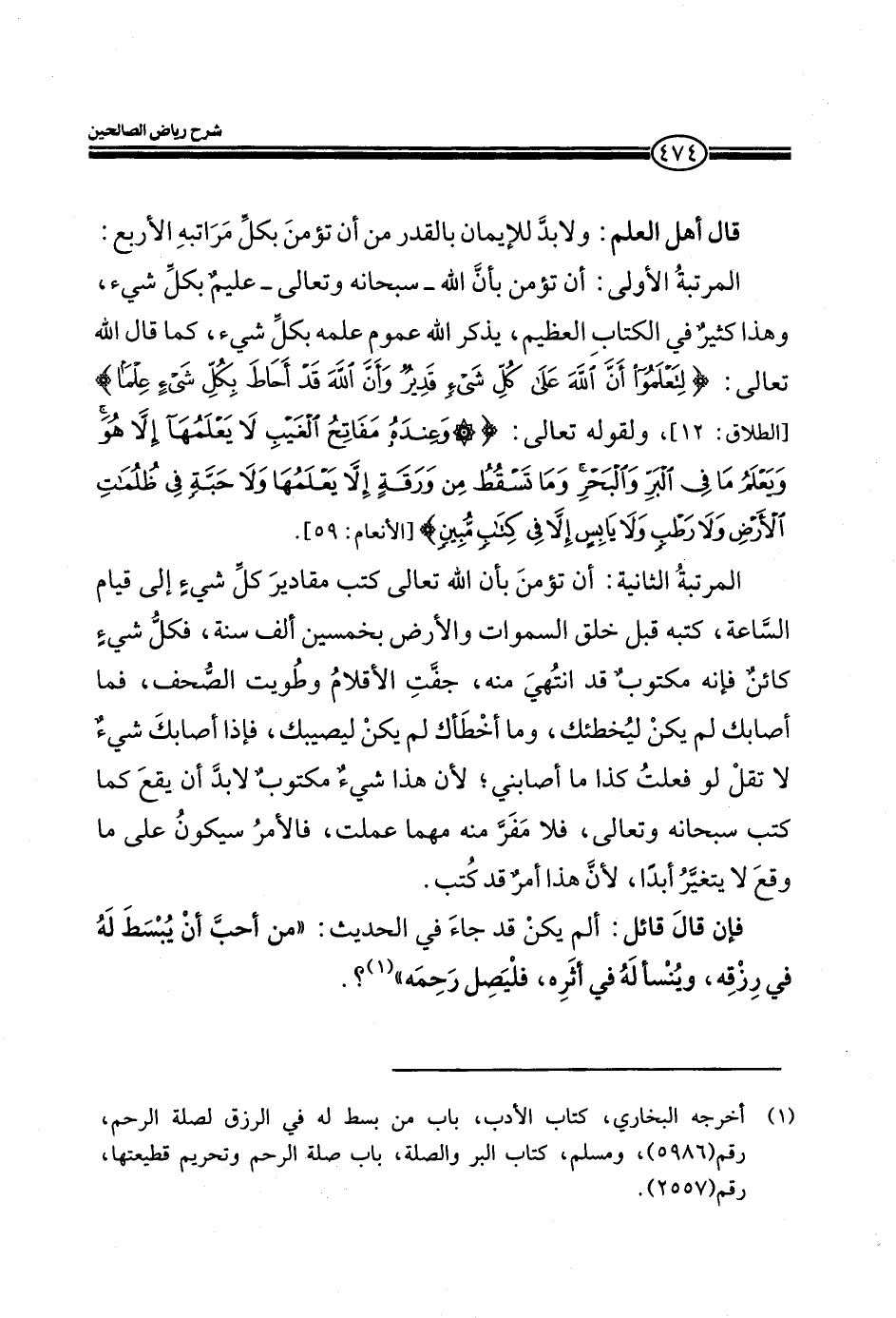 الآية59) . المرتبة الثانية: أن تؤمن بان الله تعالى كتب مقادير كل شئ إلى قيام الساعة، كتبه قبل خلق السماوات والأرض بخمسين ألف سنة، فكل شئ كائن فانه مكتوب قد انتهي منه، جفت الأقلام وطويت الصحف، فما أصابك لم يكن ليخطئك، وما أخطاءك لم يكن ليصيبك، فإذا أصابك شئ لا تقل لو فعلت كذا ما أصابني، إن هذا الشيء مكتوب لابد إن يقع كما كتب سبحانه وتعالى، قلا مفر منه مهما عملت، فالأمر سيكون علي ما وقع لا يتغير أبدا، لان هذا أمر قد كتب. فان قال قائل: ألم يكن قد جاء في الحديث: ((من احب إن يبسط له في رزقه، وينسى له في أثره، فليصل رحمه)) ؟.