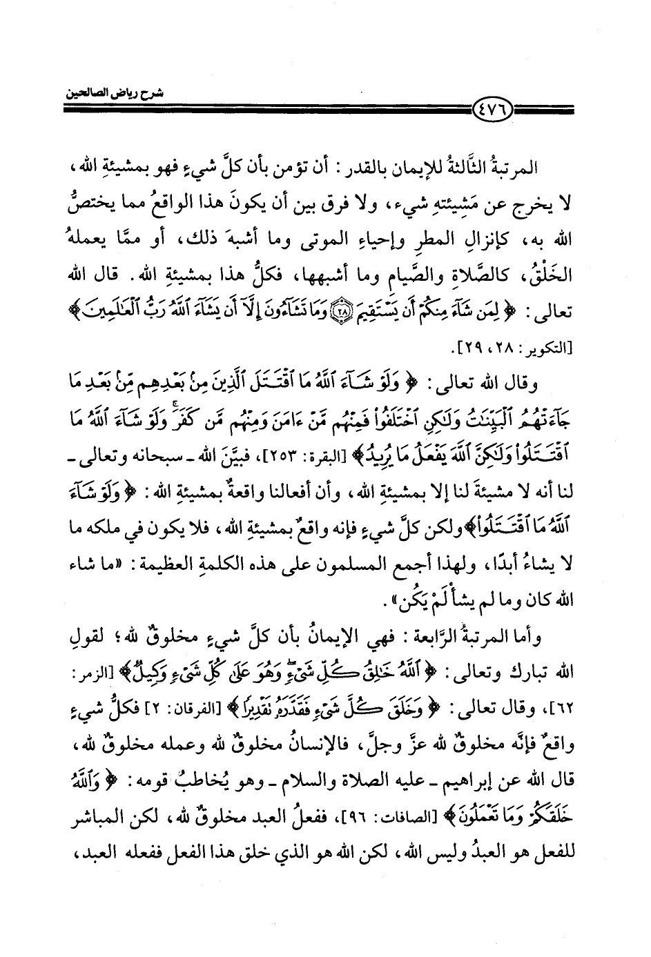 (وَمَا تَشَاءُونَ إِلَّا أَنْ يَشَاءَ اللَّهُ رَبُّ الْعَالَمِينَ) (التكوير: 29، 28) . وقال الله تعالى:) ِ وَلَوْ شَاءَ اللَّهُ مَا اقْتَتَلَ الَّذِينَ مِنْ بَعْدِهِمْ مِنْ بَعْدِ مَا جَاءَتْهُمُ الْبَيِّنَاتُ وَلَكِنِ اخْتَلَفُوا فَمِنْهُمْ مَنْ آمَنَ وَمِنْهُمْ مَنْ كَفَرَ وَلَوْ شَاءَ اللَّهُ مَا اقْتَتَلُوا وَلَكِنَّ اللَّهَ يَفْعَلُ مَا يُرِيدُ) (البقرة: من الآية253) ، فين الله_ سبحانه وتعالى_ لنا انه لا مشيئة لنا ألا بمشيئة الله، فلا يكون في ملكه ما لا يشاء أبدا، ولهذا اجمع المسلمون علي هذه الكلمة العظيمة: ((ما شاء الله كان وما لم يشاء لم يكن)) . وأما المرتبة الرابعة: فهي الإيمان بان كل شئ مخلوق لله، لقول الله تبارك وتعالى: (اللَّهُ خَالِقُ كُلِّ شَيْءٍ وَهُوَ عَلَى كُلِّ شَيْءٍ وَكِيلٌ) (الزمر: 62) ، وقال تعالى: (وَخَلَقَ كُلَّ شَيْءٍ فَقَدَّرَهُ تَقْدِيراً) (الفرقان: من الآية2) فكل شئ واقع مخلوق لله عز وجل، فالإنسان مخلوق لله وعمله مخلوق لله، قال الله عن إبراهيم_ عليه الصلاة والسلام_ وهو يخاطب قومه: (وَاللَّهُ خَلَقَكُمْ وَمَا تَعْمَلُونَ) (الصافات: 96) ، ففعل العبد مخلوق