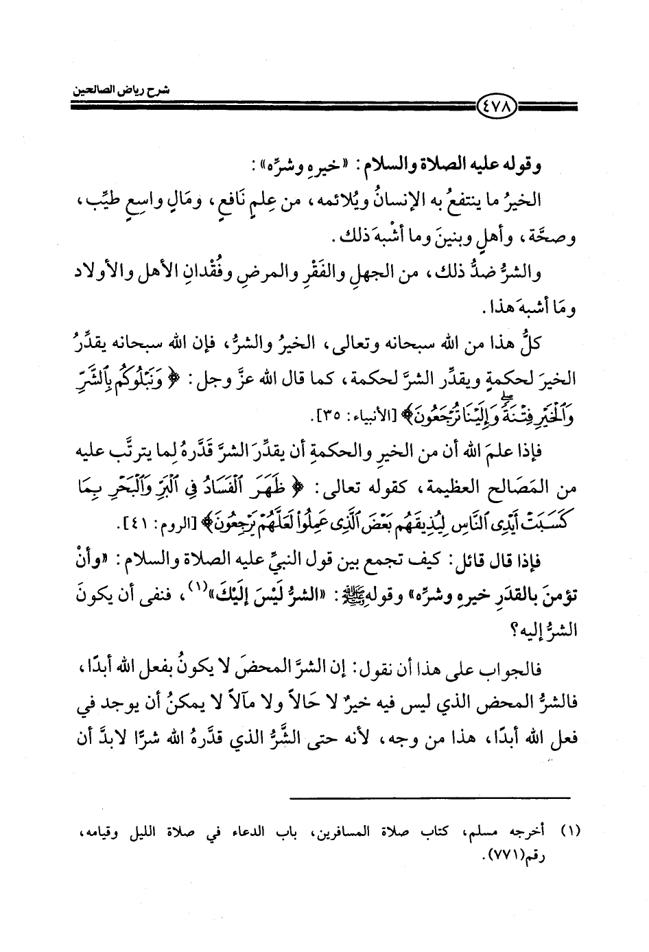 وقوله عليه الصلاة والسلام: ((خيره وشره)) : الخير ما ينتفع به الإنسان ويلائمه، من علم نافع، ومال واسع طيب، وصحة، وأهل وبنين وما أشبه ذلك. والشر ضد ذلك، من الجهل والفقر والمرض وفقدان الأهل والأولاد وما أشبه هذا. كل هذا من الله سبحانه وتعالى، والخير والشر، فان الله سبحانه يقدر الخير لحكمة ويقدر الشر لحكمة، كما قال الله عز وجل: (? وَنَبْلُوكُمْ بِالشَّرِّ وَالْخَيْرِ فِتْنَةً وَإِلَيْنَا تُرْجَعُونَ) (الأنبياء: من الآية35) . فإذا علم الله إن من الخير والحكمة إن يقدر الشر قدره لمل يترتب عليه من المصالح العظيمة، كقوله تعالى: (ظَهَرَ الْفَسَادُ فِي الْبَرِّ وَالْبَحْرِ بِمَا كَسَبَتْ أَيْدِي النَّاسِ لِيُذِيقَهُمْ بَعْضَ الَّذِي عَمِلُوا لَعَلَّهُمْ يَرْجِعُونَ) (الروم: 41) . فإذا قال قائل: كيف تجمع بين قول النبي عليه الصلاة والسلام: ((وان تؤمن بالقدر خيره وشره)) وقوله صلي الله عليه وسلم: ((الشر ليس إليك)) ، فنفي إن يكون الشر إليه؟ فالجواب علي هذا إن نقول: إن الشر المحض لا يكون بفعل الله أبدا، فالشر المحض الذي ليس فيه خيرا لا حالا ولا مالا لا يمكن إن يوجد في