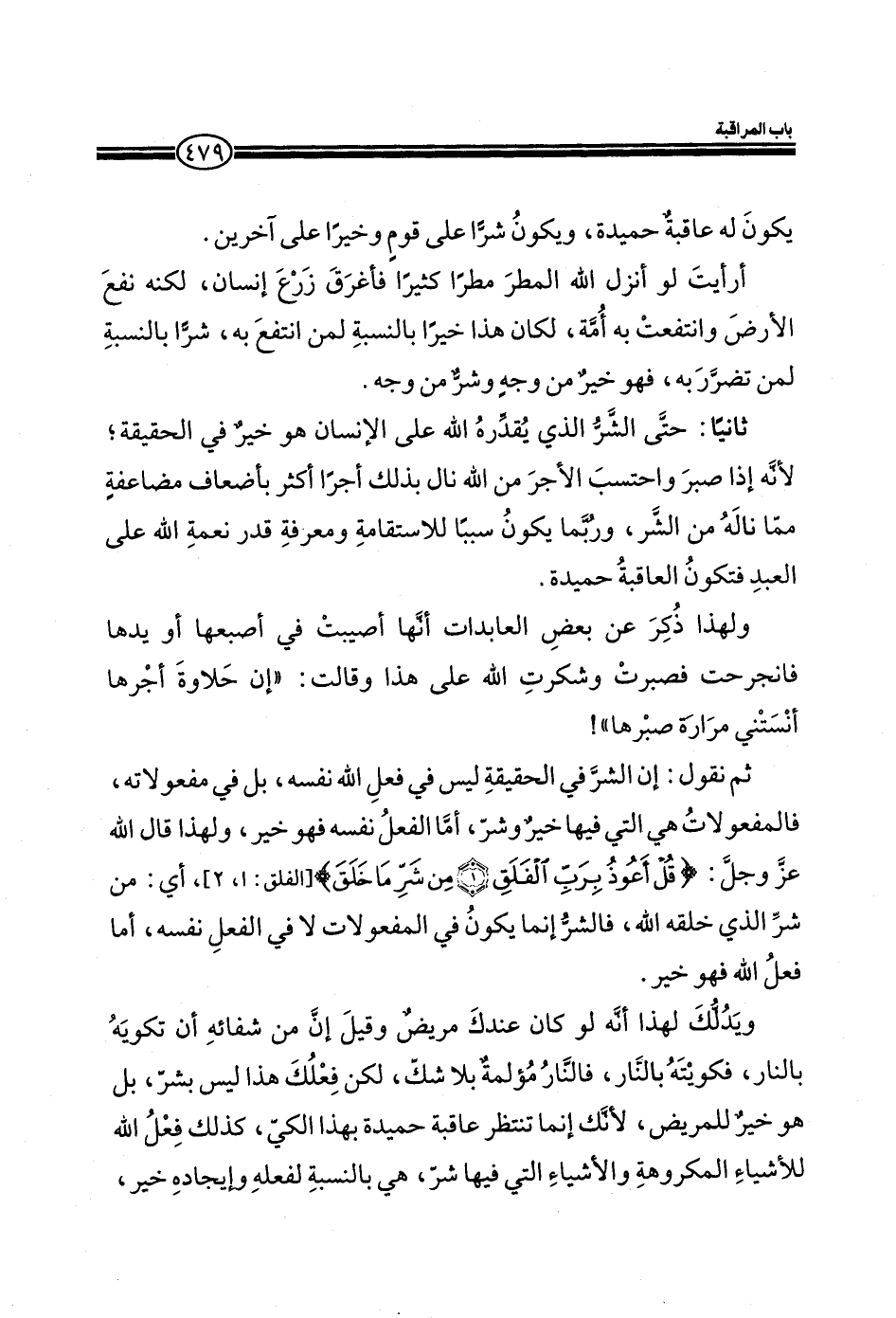 يكون له عاقبة حميدة، ويكون شرا علي قوم وخيرا علي آخرين. أرابت لو انزل الله المطر مطرا كثيرا فاغرق زرع إنسان، لكنه نفع الأرض وانتفعت به أمة، لكان هذا خيرا بالنسبة لمن انتفع به، شرا لمن تضرر به، فهو خير من وجه وشر من وجه. ثانيا: حتى الشر الذي يقدره الله علي الإنسان هو خير في الحقيقة، لان إذا صبر واحتسب الأجر من الله نال بذلك أجرا اكثر بأضعاف مضاعفة مما ناله من الشر، وربما يكون سببا للاستقامة ومعرفة قدر نعمة الله علي العبد فتكون العاقبة حميدة. ولهذا ذكر عن بعض العابدات إنها أصيبت في إصبعها أو يدها فانجرحت فصبرت وشكرت الله علي هذا وقالت: ((إن حلاوة اجرها آنستم مرارة صبرها)) ! ثم نقول: إن الشر في الحقيقة ليس في فعل الله نفسه، بل في مفعولاته، فالمفعولات هي التي فيها خير وشر، أما الفعل نفسه فهو خير، ولهذا قال الله عز وجل: (قُلْ أَعُوذُ بِرَبِّ الْفَلَقِ) (مِنْ شَرِّ مَا خَلَقَ) (الفلق: 2، 1) ، أي: من شر الذي خلقه الله، فالشر إنما يكون في المفعولات لا في الفعل نفسه، أما فعل الله فهو خير. ويدلك لهذا انه لو كان عندك مريض وقيل