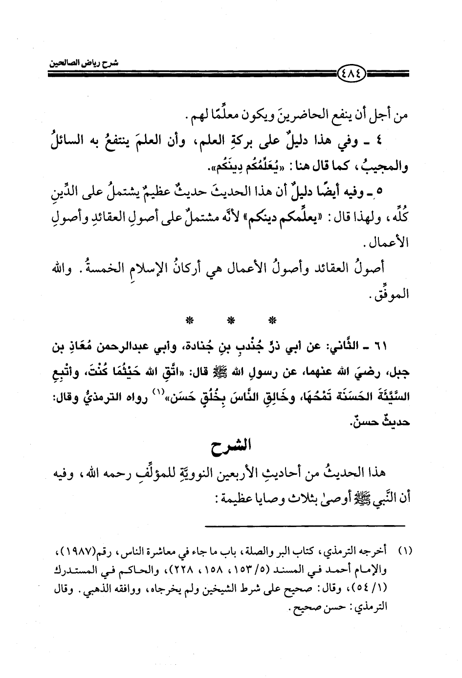 الحاضرين ويكون معلما لهم. 4_ وفي هذا دليل علي بركة العلم، وان العلم ينتفع به السائل والمجيب، كما قال هنا: ((يعلمكم دينكم)) . 5_ وفيه أيضا دليلا إن هذا الحديث حديث عظيم يشتمل علي الدين كله، ولهذا قال: ((يعلمكم دينكم)) لأنه مشتمل علي أصول العقائد وأصول الأعمال. أصول العقائد وأصول الأعمال هي أركان الإسلام الخمسة. والله الموفق. 61_ الثاني: عن أبي ذر جندب بن جنادة، وأبي عبد الرحمن معاذ بن جبل، رضي الله عنهما، عن رسول الله صلي الله عليه وسلم قال: ((اتق الله حيثما كنت، واتبع السيئة الحسنة تمحها، وخالق الناس بخلق حسن)) رواه الترمذي وقال: حديث حسن. الشرح هذا الحديث من أحاديث الأربعين النووية للمؤلف رحمه الله، وفيه إن النبي صلي الله عليه وسلم أوصى بثلاث وصايا عظيمة