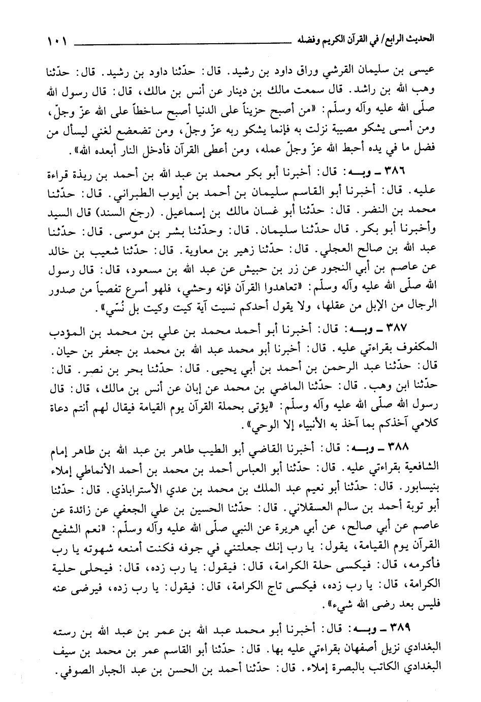 387 - أَخْبَرَنَا أَبُو أَحْمَدَ مُحَمَّدُ بْنُ عَلِيِّ بْنِ مُحَمَّدِ بْنِ الْمُؤَدِّبِ الْمَكْفُوفُ، بِقِرَاءَتِي عَلَيْهِ، قَالَ: أَخْبَرَنَا أَبُو مُحَمَّدٍ عَبْدُ اللَّهِ بْنُ مُحَمَّدِ بْنِ جَعْفَرِ بْنِ حَيَّانَ، قَالَ: حَدَّثَنَا عَبْدُ الرَّحْمَنِ بْنُ أَحْمَدَ بْنِ أَبِي يَحْيَى، قَالَ: حَدَّثَنَا بَحْرُ بْنُ نَصْرٍ، قَالَ: حَدَّثَنَا ابْنُ وَهْبٍ، قَالَ: حَدَّثَنَا الْمَاضِي بْنُ مُحَمَّدٍ، عَنْ أَبَانٍ، عَنْ أَنَسِ بْنِ مَالِكٍ، قَالَ: قَالَ رَسُولُ اللَّهِ صَلَّى اللَّهُ عَلَيْهِ وَآلِهِ وَسَلَّمَ: " يُؤْتَى بِحَمَلَةِ الْقُرْآنَ يَوْمَ الْقِيَامَةِ فَيُقَالُ لَهُمْ: أَنْتُمْ دُعَاةُ كَلَامِي آخُذُكُمْ مَا آخُذُ بِهِ الْأَنْبِيَاءَ إِلَّا الْوَحْيَ "