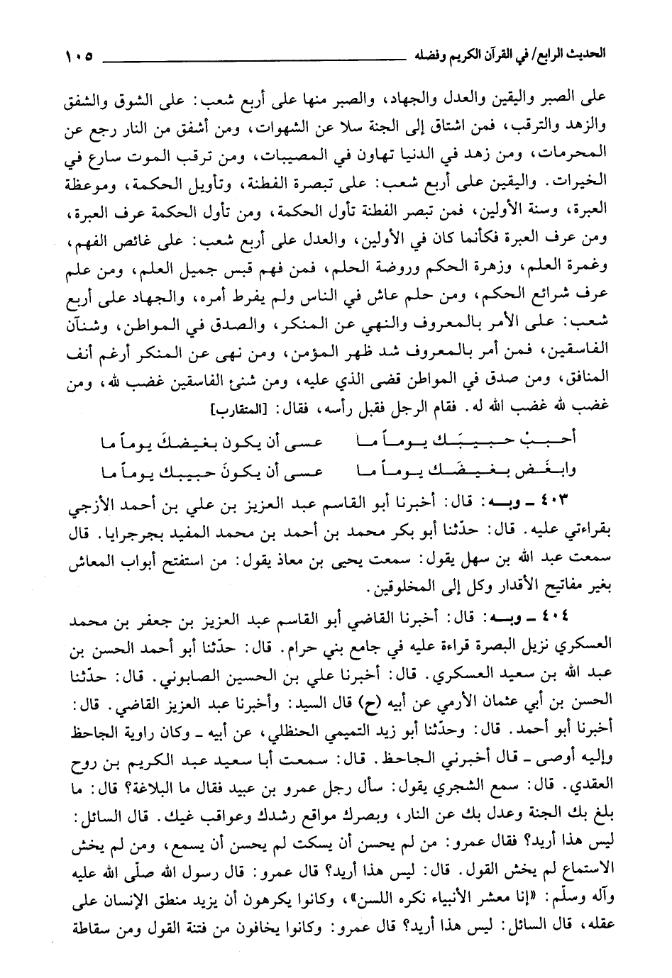 404 - أَخْبَرَنَا الْقَاضِي أَبُو الْقَاسِمِ عَبْدُ الْعَزِيزِ بْنُ جَعْفَرِ بْنِ مُحَمَّدٍ الْعَسْكَرِيُّ نَزِيلُ الْبَصْرَةِ قِرَاءَةً عَلَيْهِ فِي جَامِعِ بَنِي حَرَامٍ، قَالَ: حَدَّثَنَا أَبُو أَحْمَدَ الْحَسَنُ بْنُ عَبْدِ اللَّهِ بْنِ سَعِيدٍ الْعَسْكَرِيُّ، قَالَ: أَخْبَرَنَا عَلِيُّ بْنُ الْحُسَيْنِ الصَّابُونِيُّ، قَالَ: حَدَّثَنَا الْحُسَيْنُ بْنُ أَبِي عُثْمَانَ الْأَرْمِيُّ، عَنْ أَبِيهِ، قَالَ السَّيِّدُ: وَأَخْبَرَنَا عَبْدُ الْعَزِيزِ الْقَاضِي، قَالَ: أَخْبَرَنَا أَبُو أَحْمَدَ، قَالَ: وَحَدَّثَنَا أَبُو زَيْدٍ التَّمِيمِيُّ الْحَنْظَلِيُّ، عَنْ أَبِيهِ وَكَانَ رَاوِيَةُ الْجَاحِظِ وَإِلَيْهِ أَوْصَى، قَالَ: أَخْبَرَنِي الْجَاحِظُ، قَالَ: سَمِعْتُ أَبَا سَعِيدٍ عَبْدَ الْكَرِيمِ بْنَ رَوْحٍ الْعَقَدِيَّ، قَالَ: سَمِعَ الشَّجَرِيَّ، يَقُولُ: سَأَلَ رَجُلٌ عَمْرَو بْنَ عُبَيْدٍ، فَقَالَ: مَا الْبَلَاغَةُ؟ قَالَ: مَا بَلَغَ بِكَ الْجَنَّةَ وَعَدَلَ بِكَ عَنِ النَّارِ، وَبَصَّرَكَ مَوَاقِعَ رُشْدِكَ وَعَوَاقِبَ غَيِّكَ.