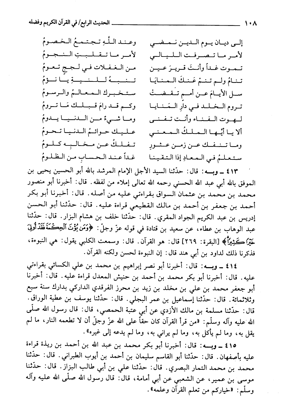 415 - أَخْبَرَنَا أَبُو بَكْرٍ مُحَمَّدُ بْنُ عَبْدِ اللَّهِ بْنِ أَحْمَدَ بْنِ رَيْذَةَ، قِرَاءَةً عَلَيْهِ بِأَصْفَهَانَ، قَالَ: حَدَّثَنَا أَبُو الْقَاسِمِ سُلَيْمَانُ بْنُ أَحْمَدَ بْنِ أَيُّوبَ الطَّبَرَانِيُّ، قَالَ: حَدَّثَنَا مُحَمَّدُ بْنُ مُحَمَّدٍ التَّمَّارُ الْبَصْرِيُّ، قَالَ: حَدَّثَنَا عَلِيُّ بْنُ أَبِي طَالِبٍ الْبَزَّازُ، قَالَ: حَدَّثَنَا مُوسَى بْنُ عُمَيْرٍ، عَنِ الشَّعْبِيِّ، عَنْ أَبِي أُمَامَةَ، قَالَ: قَالَ رَسُولُ اللَّهِ صَلَّى اللَّهُ عَلَيْهِ وَآلِهِ وَسَلَّمَ: «خِيَارُكُمْ مَنْ تَعَلَّمَ الْقُرْآنَ وَعَلَّمَهُ»