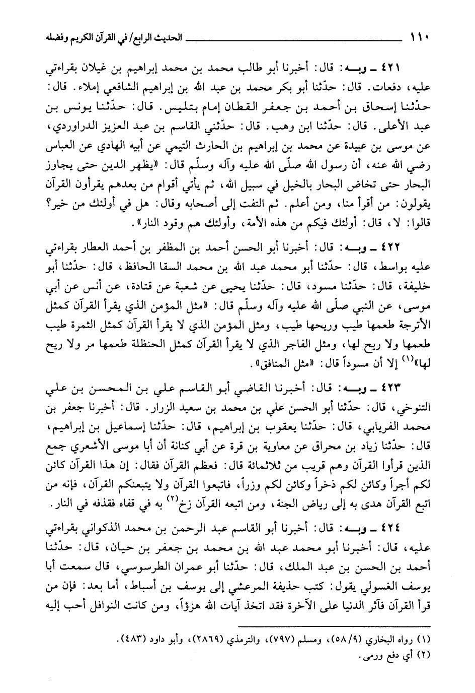 424 - أَخْبَرَنَا أَبُو الْقَاسِمِ عَبْدُ الرَّحْمَنِ بْنُ مُحَمَّدٍ الذَّكْوَانِيُّ، بِقِرَاءَتِي عَلَيْهِ، قَالَ: أَخْبَرَنَا أَبُو مُحَمَّدٍ عَبْدُ اللَّهِ بْنُ مُحَمَّدِ بْنِ جَعْفَرِ بْنِ حَيَّانَ، قَالَ: حَدَّثَنَا أَحْمَدُ بْنُ الْحَسَنِ بْنِ عَبْدِ الْمَلِكِ، قَالَ: حَدَّثَنَا أَبُو عِمْرَانَ الطَّرْسُوسِيُّ، قَالَ: سَمِعْتُ أَبَا يُوسُفَ الْغَسُولِيَّ، يَقُولُ: كَتَبَ حُذَيْفَةُ الْمَرْعَشِيُّ إِلَى يُوسُفَ بْنِ أَسْبَاطٍ «أَمَّا بَعْدُ، فَإِنَّ مَنْ قَرَأَ الْقُرْآنَ فَآثَرَ الدُّنْيَا عَلَى الْآخِرَةِ فَقَدِ اتَّخَذَ آيَاتِ اللَّهِ هُزُؤًا، وَمَنْ كَانَتِ النَّوَافِلُ أَحَبَّ