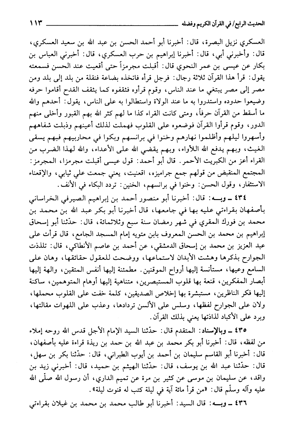 435 - وَبِالْإِسْنَادِ الْمُتَقَدِّمِ، قَالَ: حَدَّثَنَا السَّيِّدُ الْإِمَامُ الْأَجَلُّ قَدَّسَ اللَّهُ رُوحَهُ إِمْلَاءً مِنْ لَفْظِهِ، قَالَ: أَخْبَرَنَا أَبُو بَكْرٍ مُحَمَّدُ بْنُ عَبْدِ اللَّهِ بْنِ أَحْمَدَ بْنِ رَيْذَةَ، قِرَاءَةً عَلَيْهِ بِأَصْفَهَانَ، قَالَ: أَخْبَرَنَا أَبُو الْقَاسِمِ سُلَيْمَانُ بْنُ أَحْمَدَ بْنِ أَيُّوبَ الطَّبَرَانِيُّ، قَالَ: حَدَّثَنَا بَكْرُ بْنُ سَهْلٍ، قَالَ: حَدَّثَنَا عَبْدُ اللَّهِ بْنُ يُوسُفَ، قَالَ: حَدَّثَنَا الْهَيْثَمُ بْنُ حُمَيْدٍ، قَالَ: أَخْبَرَنِي زَيْدُ بْنُ وَاقِدٍ، عَنْ سُلَيْمَانَ بْنِ مُوسَى، عَنْ كَثِيرِ بْنِ مُرَّةَ، عَنْ تَمِيمٍ الدَّارِيِّ، أَنّ رَسُولَ اللَّهِ صَلَّى اللَّهُ عَلَيْهِ وَآلِهِ وَسَلَّمَ، قَالَ: «مَنْ قَرَأَ مِائَةَ آيَةٍ فِي لَيْلَةٍ كُتِبَ لَهُ قُنُوتُ لَيْلَةٍ»
