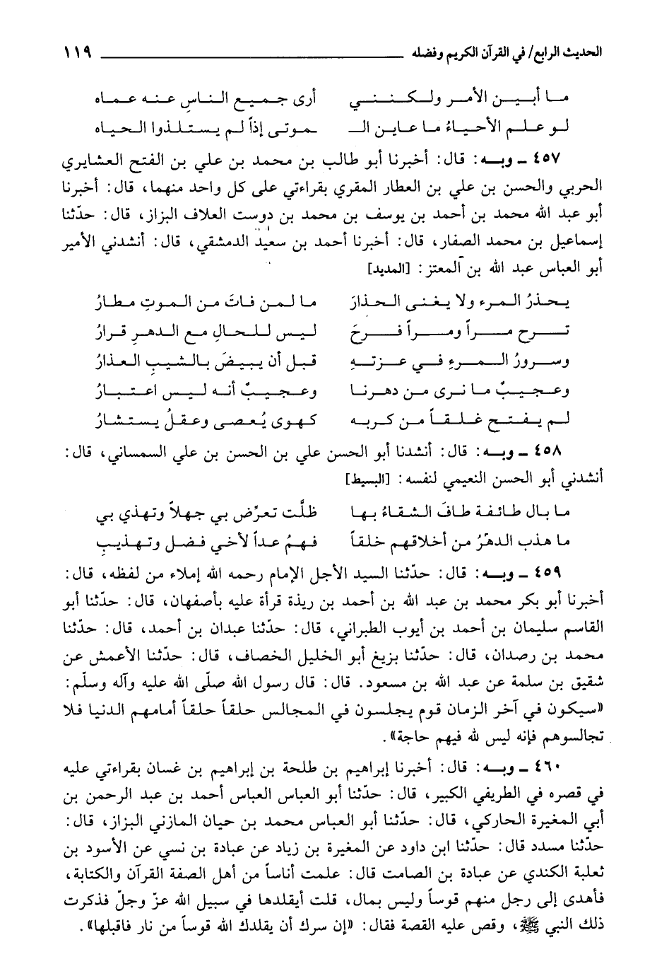 457 - أَخْبَرَنَا أَبُو طَالِبِ بْنُ مُحَمَّدِ بْنِ عَلِيِّ بْنِ الْفَتْحِ الْعَشَايِرِيُّ الْحَرْبِيُّ، وَالْحَسَنُ بْنُ عَلِيِّ بْنِ الْعَطَّارِ الْمُقْرِيُّ، بِقِرَاءَتِي عَلَى كُلِّ وَاحِدٍ مِنْهُمَا، قَالَ: أَخْبَرَنَا أَبُو عَبْدِ اللَّهِ مُحَمَّدُ بْنُ أَحْمَدَ بْنِ يُوسُفَ بْنِ مُحَمَّدِ بْنِ دُوسْتَ الْعَلَّافُ الْبَزَّازُ، قَالَ: حَدَّثَنَا إِسْمَاعِيلُ بْنُ مُحَمَّدٍ الصَّفَّارُ، قَالَ: أَخْبَرَنَا أَحْمَدُ بْنُ سَعِيدٍ الدِّمَشْقِيُّ، قَالَ: أَنْشَدَنِي الْأَمِيرُ أَبُو الْعَبَّاسِ عَبْدُ اللَّهِ بْنُ الْمُعْتَزِّ: