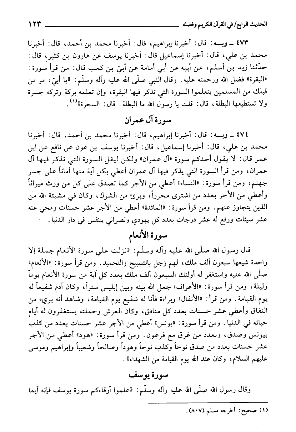 473 - أَخْبَرَنَا إِبْرَاهِيمُ، قَالَ: أَخْبَرَنَا مُحَمَّدُ بْنُ أَحْمَدَ، قَالَ: أَخْبَرَنَا مُحَمَّدُ بْنُ عَلِيٍّ، قَالَ: أَخْبَرَنَا إِسْمَاعِيلُ، قَالَ: أَخْبَرَنَا يُوسُفُ، عَنْ هَارُونَ بْنِ كَثِيرٍ، قَالَ: حَدَّثَنَا زَيْدُ بْنُ أَسْلَمَ، عَنْ أَبِيهِ، عَنْ أَبِي أُمَامَةَ، عَنْ أُبَيِّ بْنِ كَعْبٍ، قَالَ: مَنْ قَرَأَ سُورَةَ الْبَقَرَةِ فَضْلُ اللَّهِ وَرَحْمَتُهُ عَلَيْهِ.