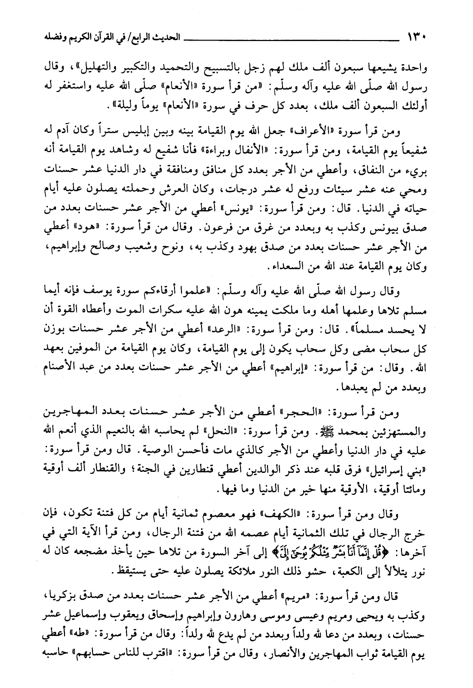 وَمَنْ قَرَأَ سُورَةَ الْأَنْفَالِ وَبَرَاءَةِ، فَأَنَا شَفِيعٌ لَهُ وَشَاهِدٍ يَوْمَ الْقِيَامَةِ أَنَّهُ بَرِئٌ مِنَ النِّفَاقِ، وَأُعْطِيَ مِنَ الْأَجْرِ بِعَدَدِ كُلِّ مُنَافِقٍ وَمُنَافِقَةٍ فِي دَارِ الدُّنْيَا عَشْرَ حَسَنَاتٍ، وَمُحِيَ عَنْهُ عَشْرُ سَيِّئَاتٍ، وَرُفِعَ لَهُ عَشْرُ دَرَجَاتٍ، وَكَانَ الْعَرْشُ وَحَمَلَتُهُ يُصَلُّونَ عَلَيْهِ أَيَّامَ حَيَاتِهِ فِي الدُّنْيَا» ، قَالَ: «وَمَنْ قَرَأَ سُورَةَ يُونُسَ أُعْطِيَ مِنَ الْأَجْرِ عَشْرَ حَسَنَاتٍ بِعَدَدِ مَنْ صَدَّقَ بِيُونُسَ وَكَذَّبَ بِهِ وَبِعَدَدِ مَنْ غَرِقَ مِنْ فِرْعَوْنَ» ، وَقَالَ: «مَنْ قَرَأَ سُورَةَ هُودٍ أُعْطِيَ مِنَ الْأَجْرِ عَشْرَ حَسَنَاتٍ بِعَدَدِ مَنْ صَدَّقَ بِهُودٍ وَكَذَّبَ بِهِ، وَنُوحٍ، وَشُعَيْبٍ، وَصَالِحٍ، وَإِبْرَاهِيمَ، وَكَانَ يَوْمَ الْقِيَامَةِ عَنْدَ اللَّهِ مِنَ السُّعَدَاءِ» .