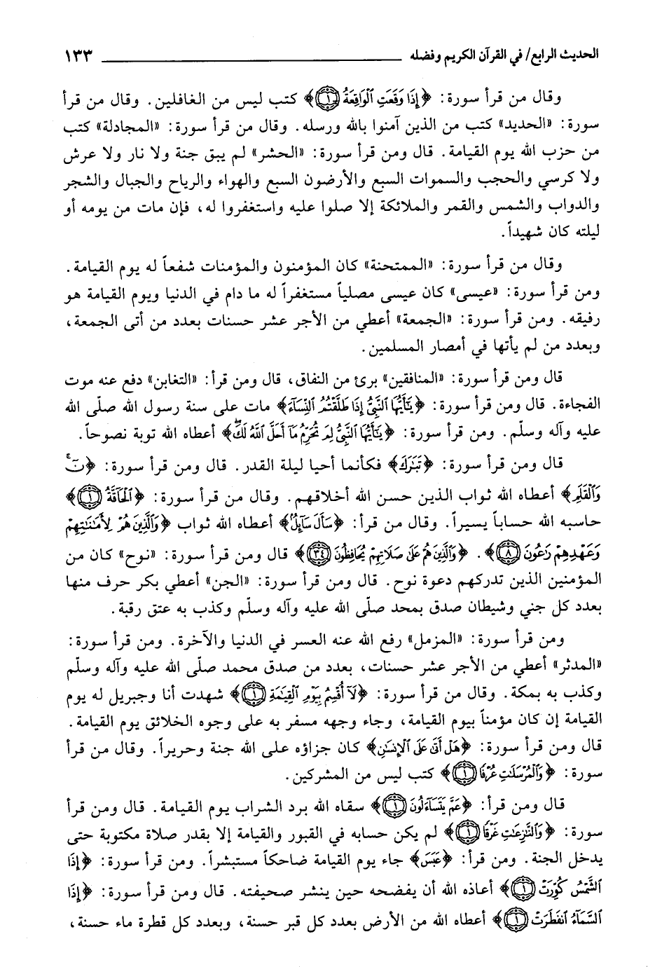 وَقَالَ: " مَنْ قَرَأَ سُورَةَ إِذَا وَقَعَتِ الْوَاقِعَةُ كُتِبَ لَيْسَ مِنَ الْغَافِلِينَ.