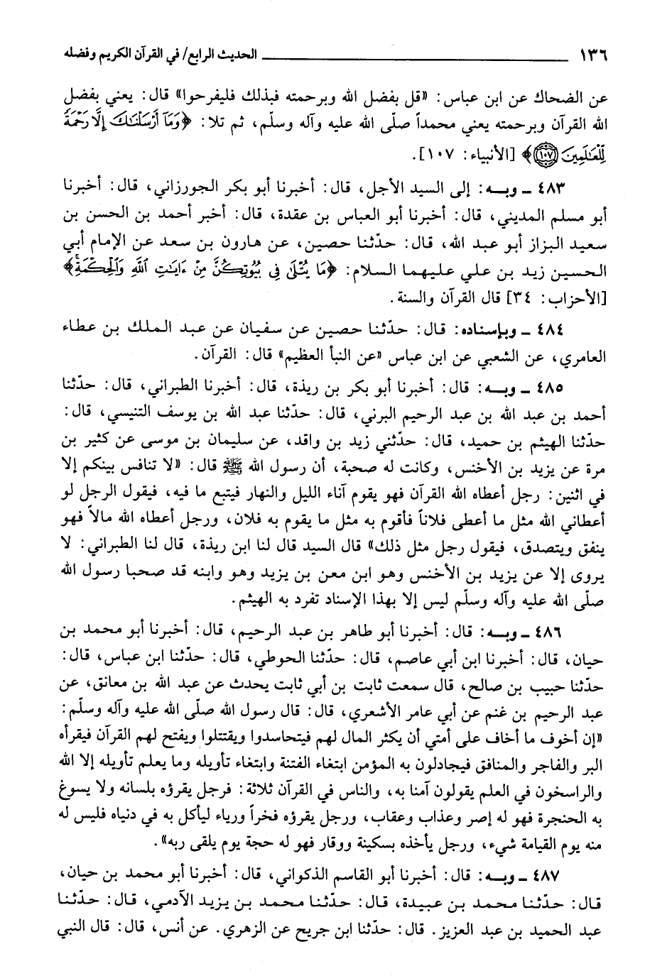 483 - أَخْبَرَنَا أَبُو بَكْرٍ الْجَوْزَرَانِيُّ، قَالَ: أَخْبَرَنَا أَبُو مُسْلِمٍ الْمَدِينِيُّ، قَالَ: إِبْرَاهِيمُ أَبُو الْعَبَّاسِ بْنُ عُقْدَةَ، قَالَ: أَخْبَرَنَا أَحْمَدُ بْنُ الْحَسَنِ بْنِ سَعِيدٍ الْبَزَّازُ أَبُو عَبْدِ اللَّهِ، قَالَ: حَدَّثَنَا حُصَيْنٌ، عَنْ هَارُونَ بْنِ سَعْدٍ، عَنِ الْإِمَامِ أَبِي الْحُسَيْنِ زَيْدُ بْنُ عَلِيٍّ، عَلَيْهِمَا السَّلَامُ: " {مَا يُتْلَى فِي بُيُوتِكُنَّ مِنْ آيَاتِ اللَّهِ وَالْحِكْمَةِ} [الأحزاب: 34] قَالَ: الْقُرْآنُ وَالسُّنَّةُ ".