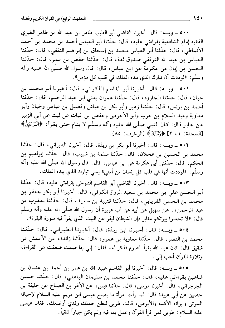 501 - أَخْبَرَنَا أَبُو الْقَاسِمِ الذَّكْوَانِيُّ، قَالَ: أَخْبَرَنَا أَبُو مُحَمَّدِ بْنِ حَيَّانَ، قَالَ: حَدَّثَنَا الْجَارُودُ، قَالَ: حَدَّثَنَا عِمْرَانُ يَعْنِي ابْنَ عَبْدِ الرَّحِيمِ، قَالَ: حَدَّثَنَا أَحْمَدُ بْنُ يُونُسَ، قَالَ: حَدَّثَنَا زُهَيْرٌ، وَأَبُو بَكْرِ بْنُ عَيَّاشٍ، وَفُضَيْلُ بْنُ عِيَاضٍ، وَخَبَّانُ، وَأَبُو مُعَاوِيَةَ، وَعَبْدُ السَّلَامِ بْنُ حَرْبٍ، وَأَبُو الْأَحْوَصِ، وَحَفْصُ بْنُ غِيَاثٍ، عَنْ لَيْثٍ، عَنْ أَبِي الزُّبَيْرِ، عَنْ جَابِرٍ، قَالَ: " كَانَ النَّبِيُّ صَلَّى اللَّهُ عَلَيْهِ وَآلِهِ وَسَلَّمَ لَا يَنَامُ حَتَّى يَقْرَأَ: الم تَنْزِيلُ وَتَبَارَكَ "