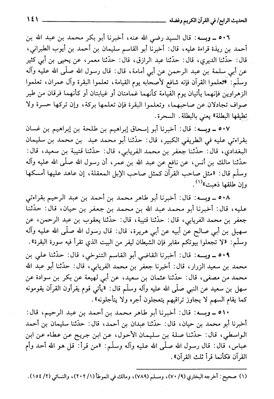 506 - قَالَ السَّيِّدُ رَضِيَ اللَّهُ عَنْهُ: أَخْبَرَنَا أَبُو بَكْرٍ مُحَمَّدُ بْنُ عَبْدِ اللَّهِ بْنُ أَحْمَدَ بْنِ رَيْذَةَ، قِرَاءَةً عَلَيْهِ، قَالَ: أَخْبَرَنَا أَبُو الْقَاسِمِ سُلَيْمَانُ بْنُ أَحْمَدَ بْنِ أَيُّوبَ الطَّبَرَانِيُّ، قَالَ: حَدَّثَنَا الدِّيرِيُّ، قَالَ: حَدَّثَنَا عَبْدُ الرَّازِقِ، قَالَ: حَدَّثَنَا مَعْمَرٌ، عَنْ يَحْيَى بْنِ أَبِي كَثِيرٍ، عَنْ أَبِي سَلَمَةَ بْنِ عَبْدِ الرَّحْمَنِ، عَنْ أَبِي أُمَامَةَ، قَالَ: قَالَ رَسُولُ اللَّهِ صَلَّى اللَّهُ عَلَيْهِ وَآلِهِ وَسَلَّمَ: «تَعَلَّمُوا الْقُرْآنَ فَإِنَّهُ شَافِعٌ لِأَصْحَابِهِ يَوْمَ الْقِيَامَةِ، تَعَلَّمُوا الْبَقَرَةَ وَآلَ عِمْرَانَ، تَعَلَّمُوا الزَّهْرَاوَيْنِ فَإِنَّهُمَا يَأْتِيَانِ يَوْمَ الْقِيَامَةِ كَأَنَّهُمَا غَمَامَتَانِ، أَوْ غَيَابَتَانِ، أَوْ كَأَنَّهُمَا فِرْقَانِ مِنْ طَيْرٍ صَوَافٍّ تُجَادِلَانِ عَنْ صَاحِبِهِمَا، وَتَعَلَّمُوا الْبَقَرَةَ فَإِنَّ تَعَلُّمَهَا بَرَكَةٌ، وَإِنَّ تَرْكَهَا حَسْرَةٌ وَلَا تُطِيقُهَا الْبَطَلَةُ» ، يَعْنِي: السَّحَرَةُ