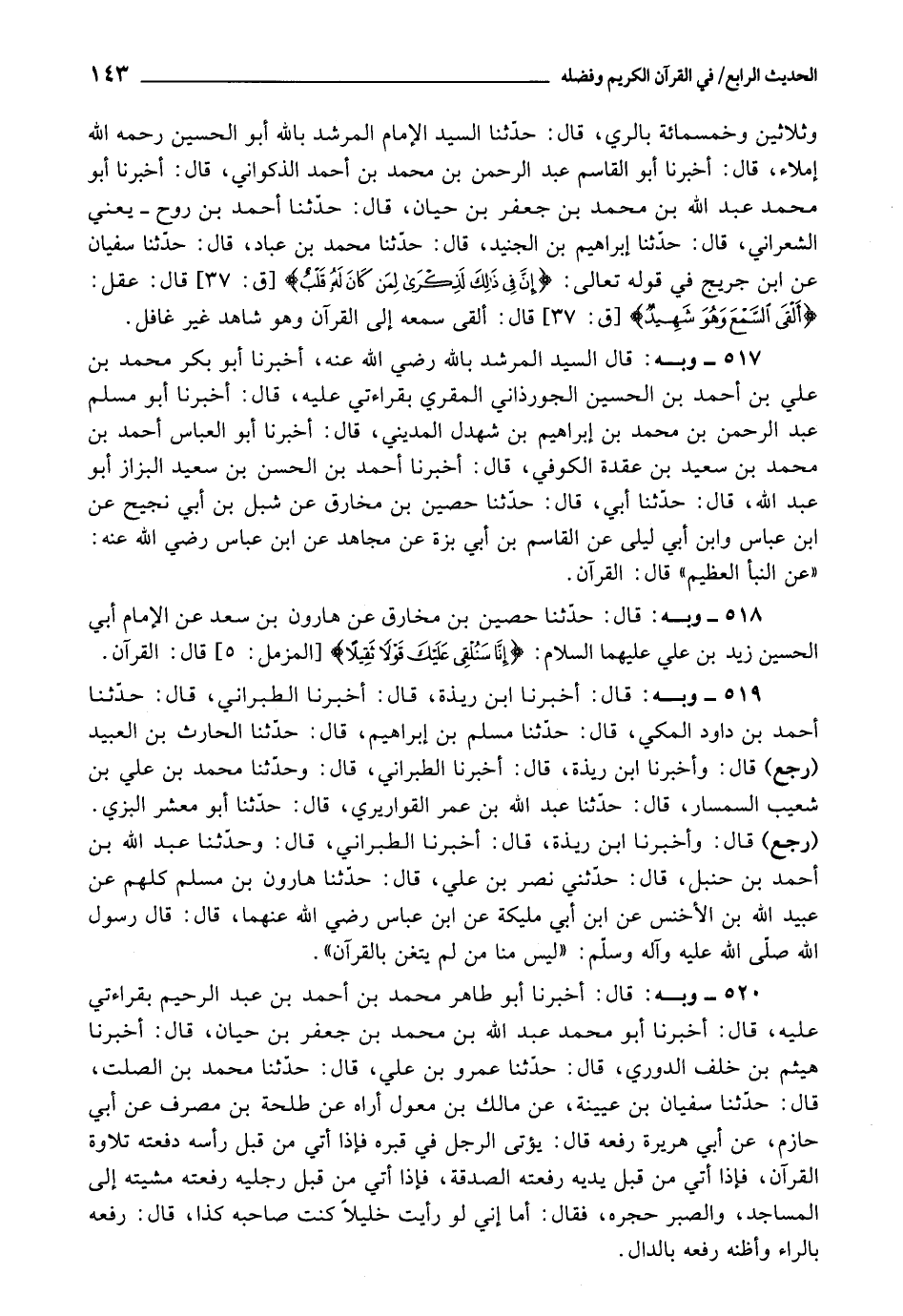وَثَلَاثِينَ وَخَمْسِ مِائَةٍ بِالرَّيِّ، قَالَ: حَدَّثَنَا السَّيِّدُ الْإِمَامُ الْمُرْشِدُ بِاللَّهِ أَبُو الْحُسَيْنِ، رَحِمَهُ اللَّهُ إِمْلَاءً، قَالَ: أَخْبَرَنَا أَبُو الْقَاسِمِ عَبْدُ الرَّحْمَنِ بْنُ مُحَمَّدِ بْنِ أَحْمَدَ الذَّكْوَانِيُّ، قَالَ: أَخْبَرَنَا أَبُو مُحَمَّدٍ عَبْدُ اللَّهِ بْنُ جَعْفَرِ بْنِ حَيَّانَ، قَالَ: حَدَّثَنَا أَحْمَدُ بْنُ رَوْحٍ يَعْنِي الشَّعْرَانِيَّ، قَالَ: حَدَّثَنَا إِبْرَاهِيمُ بْنُ الْجُنَيْدِ، قَالَ: حَدَّثَنَا مُحَمَّدُ بْنُ عَبَّادٍ، قَالَ: حَدَّثَنَا سُفْيَانُ، عَنِ ابْنِ جُرَيْجٍ، فِي قَوْلِهِ تَعَالَى " {إِنَّ فِي ذَلِكَ لَذِكْرَى لِمَنْ كَانَ لَهُ قَلْبٌ} [ق: 37] قَالَ: عَقْلٌ {أَلْقَى السَّمْعَ وَهُوَ شَهِيدٌ} [ق: 37] أَلْقَى سَمْعَهُ إِلَى الْقُرْآنِ وَهُوَ شَاهِدٌ غَيْرُ غَافِلٍ ".