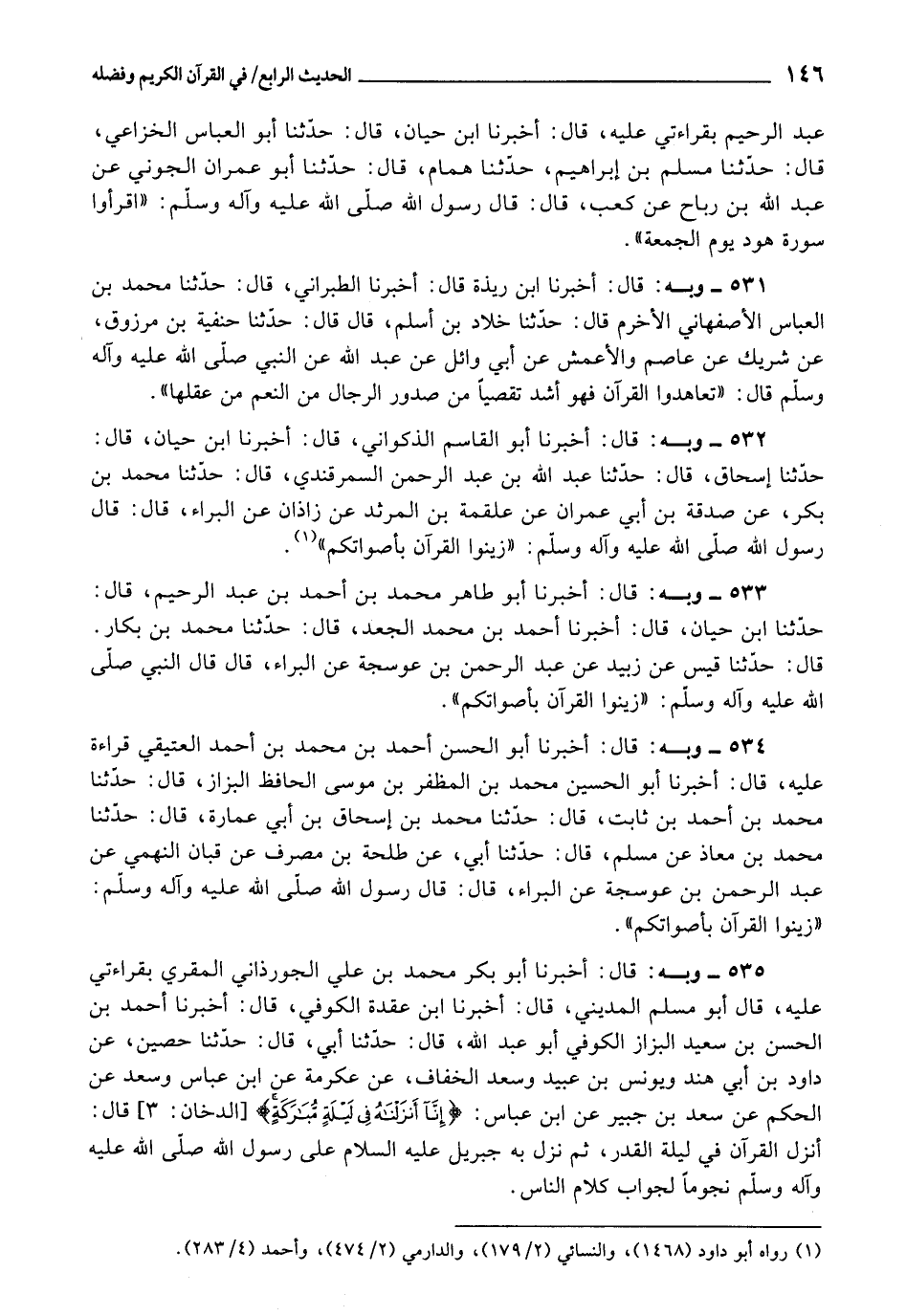 532 - أَخْبَرَنَا أَبُو الْقَاسِمِ الذَّكْوَانِيُّ، قَالَ: أَخْبَرَنَا ابْنُ حَيَّانَ، قَالَ: حَدَّثَنَا إِسْحَاقُ، قَالَ: حَدَّثَنَا عَبْدُ اللَّهِ بْنُ عَبْدِ الرَّحْمَنِ السَّمَرْقَنْدِيُّ، قَالَ: حَدَّثَنَا مُحَمَّدُ بْنُ بَكْرٍ، عَنْ صَدَقَةَ بْنِ عِمْرَانَ، عَنْ عَلْقَمَةَ بْنِ الْمَرْثَدِ، عَنْ زَاذَانَ، عَنِ الْبَرَّاءِ، قَالَ: قَالَ رَسُولُ اللَّهِ صَلَّى اللَّهُ عَلَيْهِ وَآلِهِ وَسَلَّمَ: «زَيِّنُوا الْقُرْآنَ بِأَصْوَاتِكُمْ»