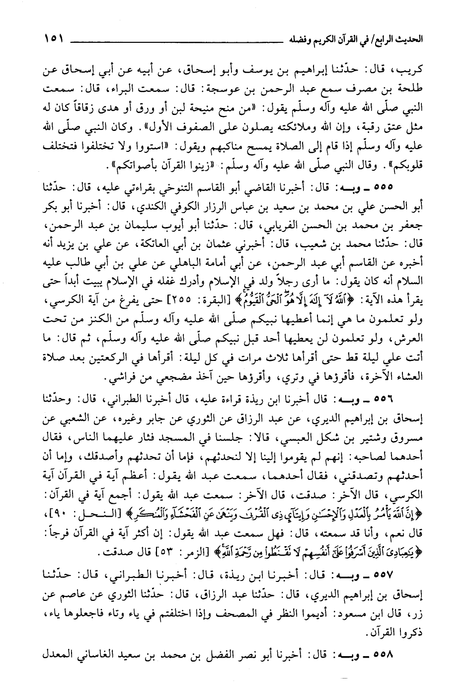 555 - أَخْبَرَنَا الْقَاضِي أَبُو الْقَاسِمِ التَّنُوخِيُّ، بِقِرَاءَتِي عَلَيْهِ، قَالَ: حَدَّثَنَا أَبُو الْحَسَنِ عَلِيُّ بْنُ مُحَمَّدِ بْنِ سَعِيدِ بْنِ عَبَّاسٍ الرَّزَّازُ الْكُوفِيَّ الْكِنْدِيُّ، قَالَ: أَخْبَرَنَا أَبُو بَكْرٍ جَعْفَرُ بْنُ مُحَمَّدِ بْنِ الْحَسَنِ الْفِرْيَابِيُّ، قَالَ: حَدَّثَنَا أَبُو أَيُّوبَ سُلَيْمَانُ بْنُ عَبْدِ الرَّحْمَنِ، قَالَ: حَدَّثَنَا مُحَمَّدُ بْنُ شُعَيْبٍ، قَالَ: أَخْبَرَنِي عُثْمَانُ بْنُ أَبِي الْعَاتِكَةِ، عَنْ عَلِيِّ بْنِ يَزِيدَ، أَنَّهُ أَخْبَرَهُ عَنِ الْقَاسِمِ أَبِي عَبْدِ الرَّحْمَنِ، عَنْ أَبِي أُمَامَةَ الْبَاهِلِيِّ، عَنْ عَلِيِّ بْنِ أَبِي طَالِبٍ عَلَيْهِ السَّلَامُ أَنَّهُ كَانَ يَقُولُ: مَا أَرَى رَجُلًا وُلِدَ فِي الْإِسْلَامِ وَأَدْرَكَ غَفْلَةً فِي الْإِسْلَامِ يَبِيتُ أَبَدًا حَتَّى يَقْرَأَ هَذِهِ الْآيَةَ: {اللَّهُ لا إِلَهَ إِلا هُوَ الْحَيُّ الْقَيُّومُ} [البقرة: 255] حَتَّى يَفْرَغَ مِنْ آيَةِ الْكُرْسِيِّ، وَلَوْ تَعْلَمُونَ مَا هِيَ إِنَّمَا أُعْطِيَهَا نَبِيُّكُمْ صَلَّي اللَّهُ عَلَيْهِ وَآلِهِ وَسَلَّمَ مِنَ الْكَنْزِ مِنْ تَحْتِ الْعَرْشِ، وَلَوْ تَعْلَمُونَ لَمْ يُعْطَهَا أَحَدٌ قَبْلَ نَبِيِّكُمْ صَلَّى اللَّهُ عَلَيْهِ وَآلِهِ وَسَلَّمَ "، ثُمَّ قَالَ: " مَا أَتَتْ عَلَيَّ لَيْلَةٌ قَطُّ حَتَّى أَقْرَأُهَا ثَلَاثَ مَرَّاتٍ فِي كُلِّ لَيْلَةٍ: أَقْرَأُهَا فِي الرَّكْعَتَيْنِ بَعْدَ صَلَاةِ الْعِشَاءِ الْآخِرَةِ، فَأَقْرَؤُهَا فِي وَتْرِي، وَأَقْرَؤُهَا حِينَ آخُذُ مَضْجَعِي مِنْ فِرَاشِي "