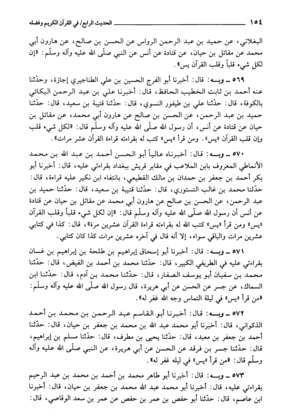 569 - أَخْبَرَنَا أَبُو الْفَرَجِ الْحَسَنُ بْنُ عَلِيٍّ الطَّنَاجِيرِيُّ إِجَازَةً، وَحَدَّثَنَا عَنْهُ أَحْمَدُ بْنُ ثَابِتٍ الْخَطِيبُ الْحَافِظُ، قَالَ: أَخْبَرَنَا عَلِيُّ بْنُ عَبْدِ الرَّحْمَنِ الْبَكَّائِيُّ، بِالْكُوفَةِ، قَالَ: حَدَّثَنَا عَلِيُّ بْنُ طَيْفُورٍ النَّسَوِيُّ، قَالَ: حَدَّثَنَا قُتَيْبَةُ بْنُ سَعِيدٍ، قَالَ: حَدَّثَنَا حُمَيْدُ بْنُ عَبْدِ الرَّحْمَنِ، عَنِ الْحَسَنِ بْنِ صَالِحٍ، عَنْ هَارُونَ أَبِي مُحَمَّدٍ، عَنْ مُقَاتِلِ بْنِ حَيَّانَ، عَنْ قَتَادَةَ، عَنْ أَنَسٍ، أَنّ رَسُولَ اللَّهِ صَلَّى اللَّهُ عَلَيْهِ وَآلِهِ وَسَلَّمَ، قَالَ: «لِكُلِّ شَيْءٍ قَلْبٌ وَإِنَّ قَلْبَ الْقُرْآنِ يس، وَمَنْ قَرَأَ يس كُتِبَ لَهُ بِقِرَاءَتِهِ قِرَاءَةُ الْقُرْآنِ عَشْرَ مَرَّاتٍ»